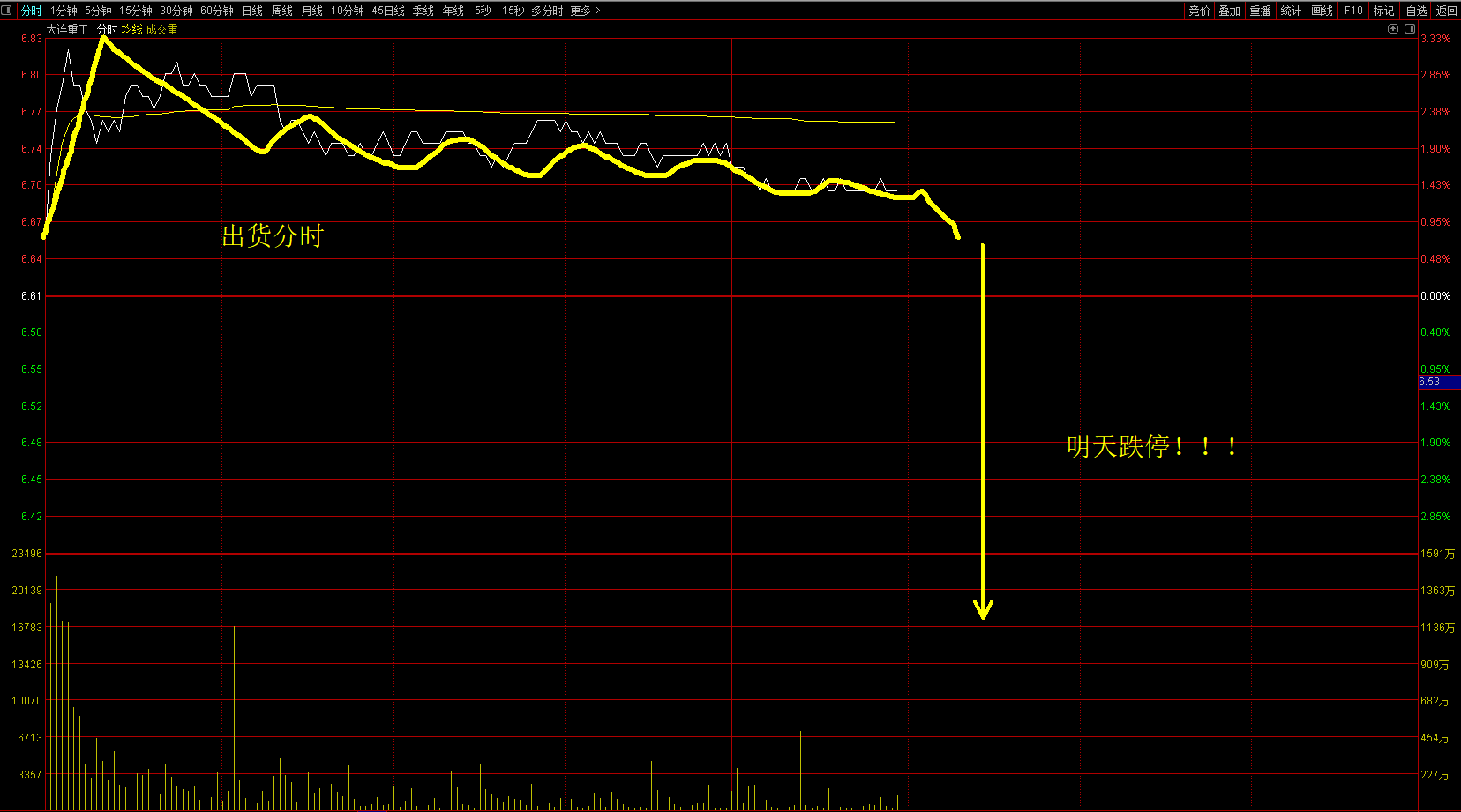 如图,今天急拉缓跌,诱多出货!!!明天大跌10个点!