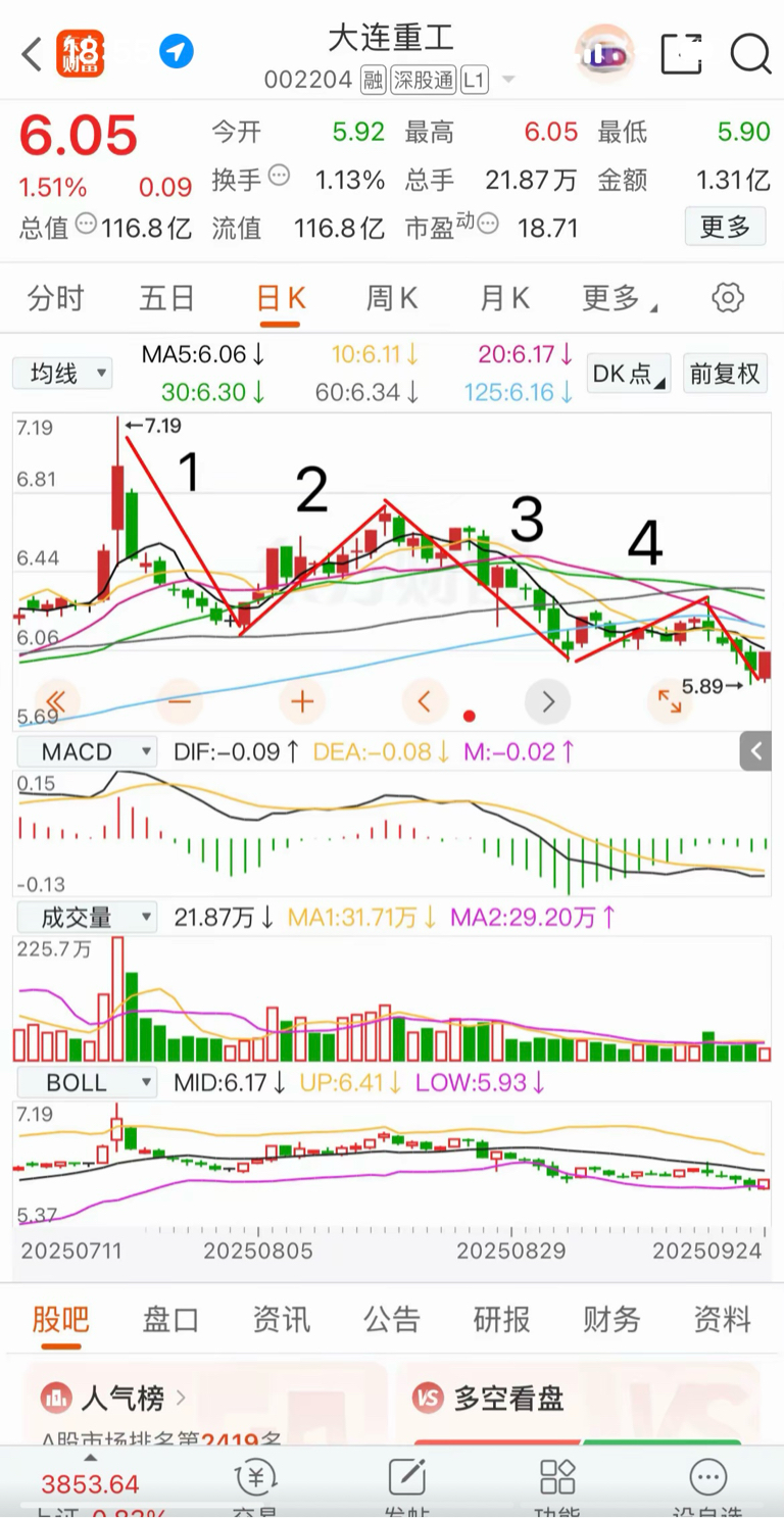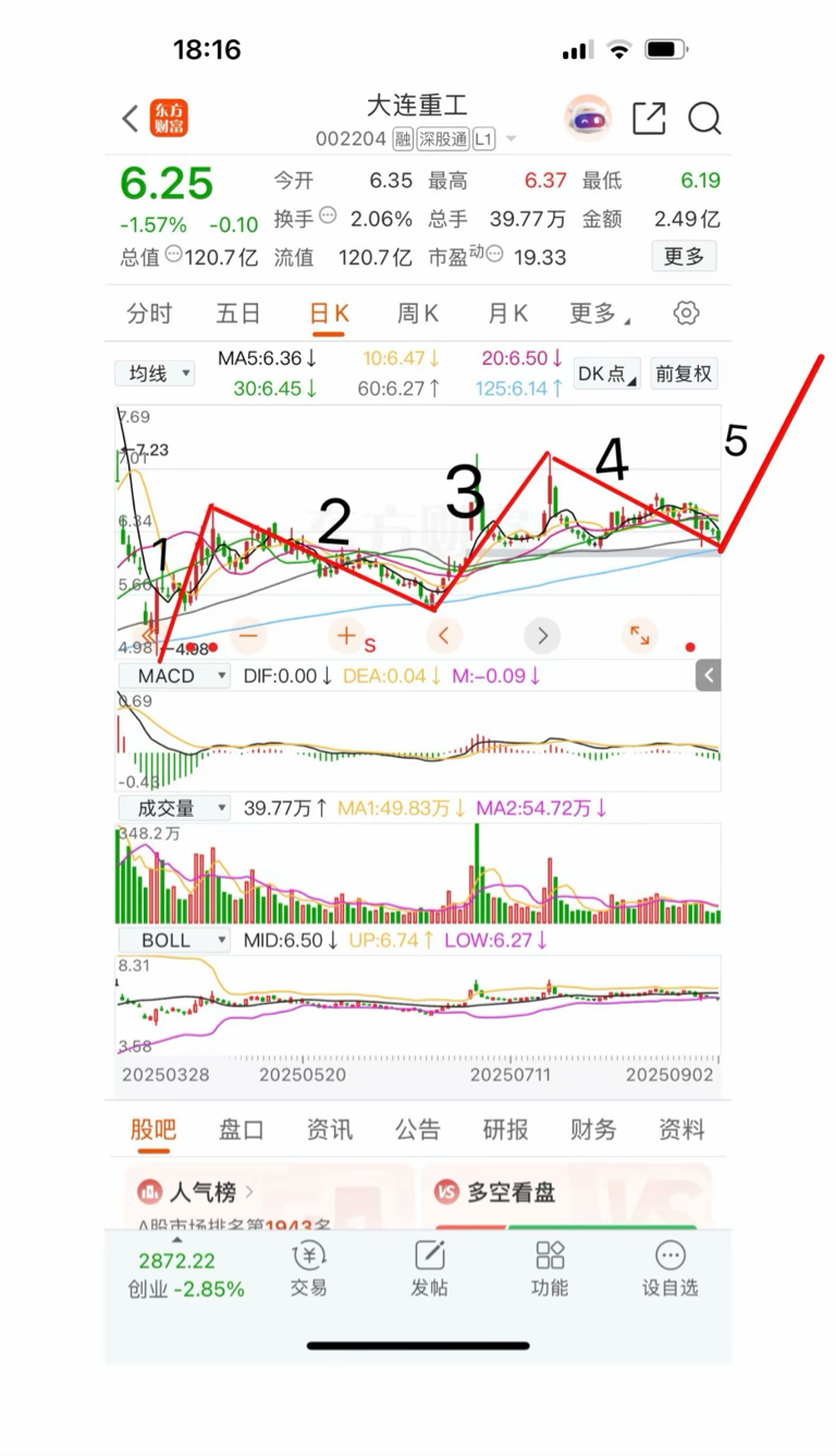 $大连重工(SZ002204)$ 之前做过这个,玩短线熬不动就走了,上升五浪的话应该走完了,这里缩量背离上去的,不补量突破风险大过机会。第四浪分五个小浪,第五浪也是五个小浪的话,现在就是上方缺口压力,都等突破呢,注意风险,有事常联系