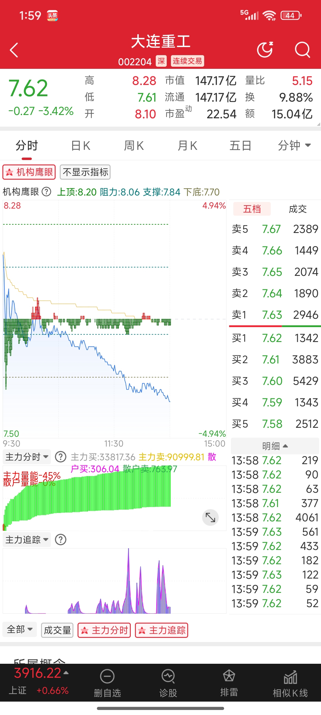 $大连重工(SZ002204)$ 主力跑了6个亿了。