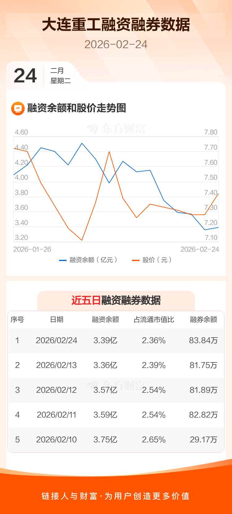 交易所最新数据显示,大连重工于2026年2月24日获融资买入2616.21万元,融资偿还2283.66万元,当日融资净买入332.55万元。目前,该股融资余额3.39亿,占流通市值比例为2.36%。