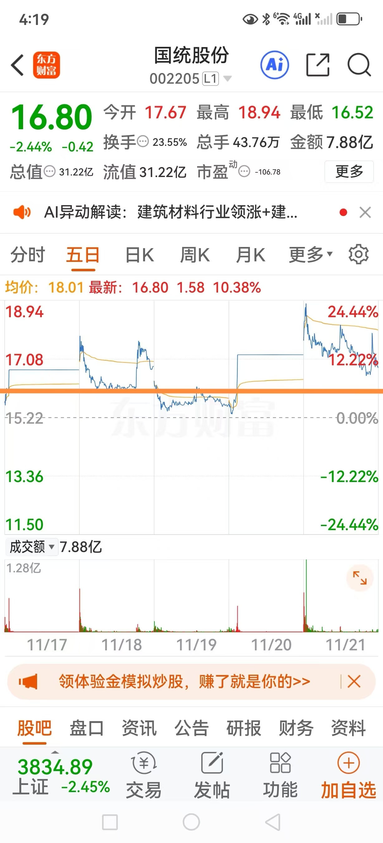 提高保护价,收盘价低于16.90元我止损。