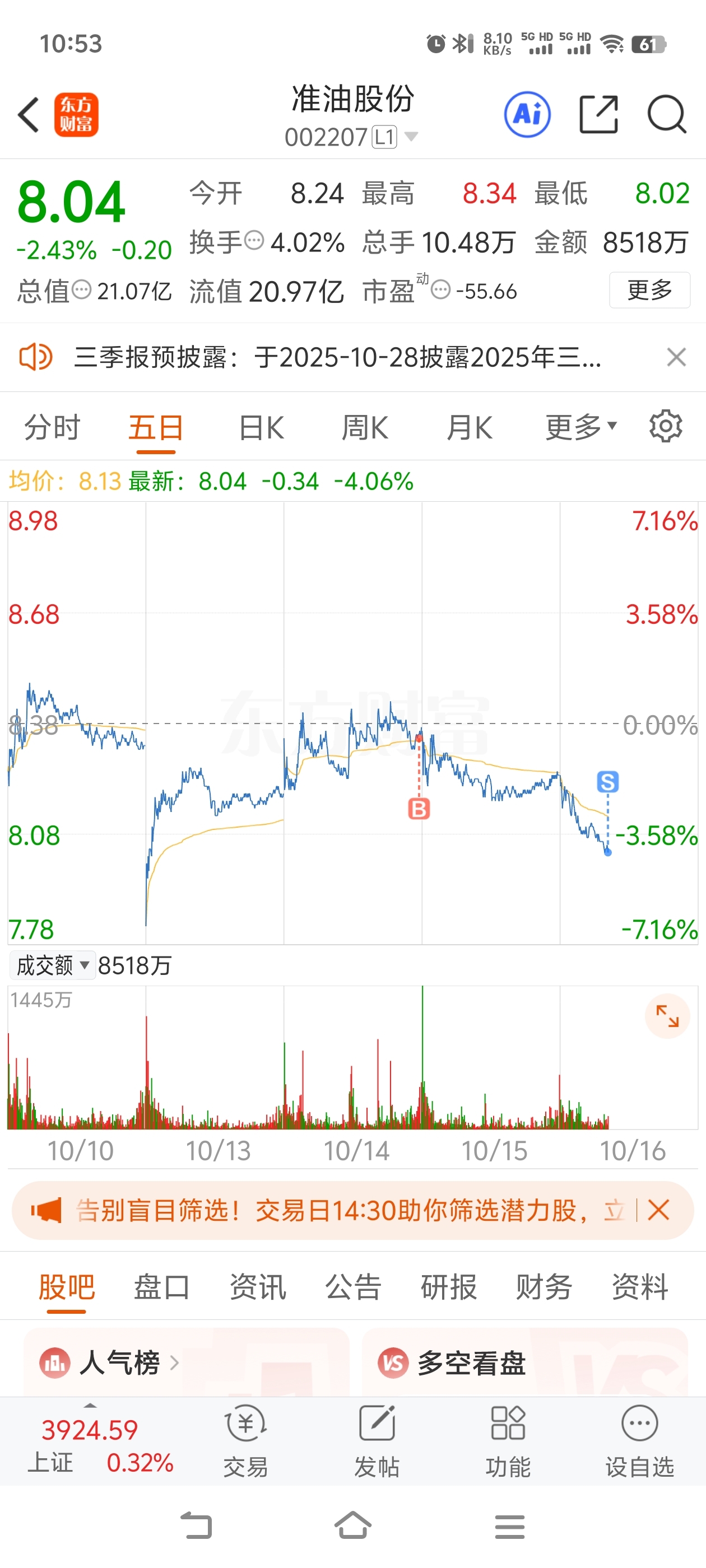 $准油股份(SZ002207)$ 亏了,四个点,删除,换股 这菜鸟股 没必要玩