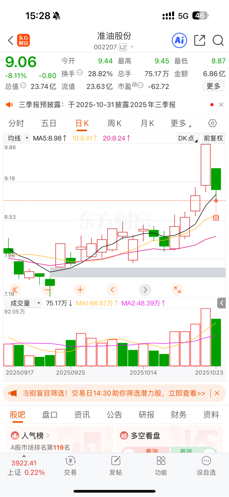 $准油股份(SZ002207)$ 板块最高回撤3个点多,下午盘面明显有资金潜底吃昨天打板的带血筹码,钝刀子一刀刀的上,另外很不理解的一个点,地板不敢接,一冲就敢买 什么心态!