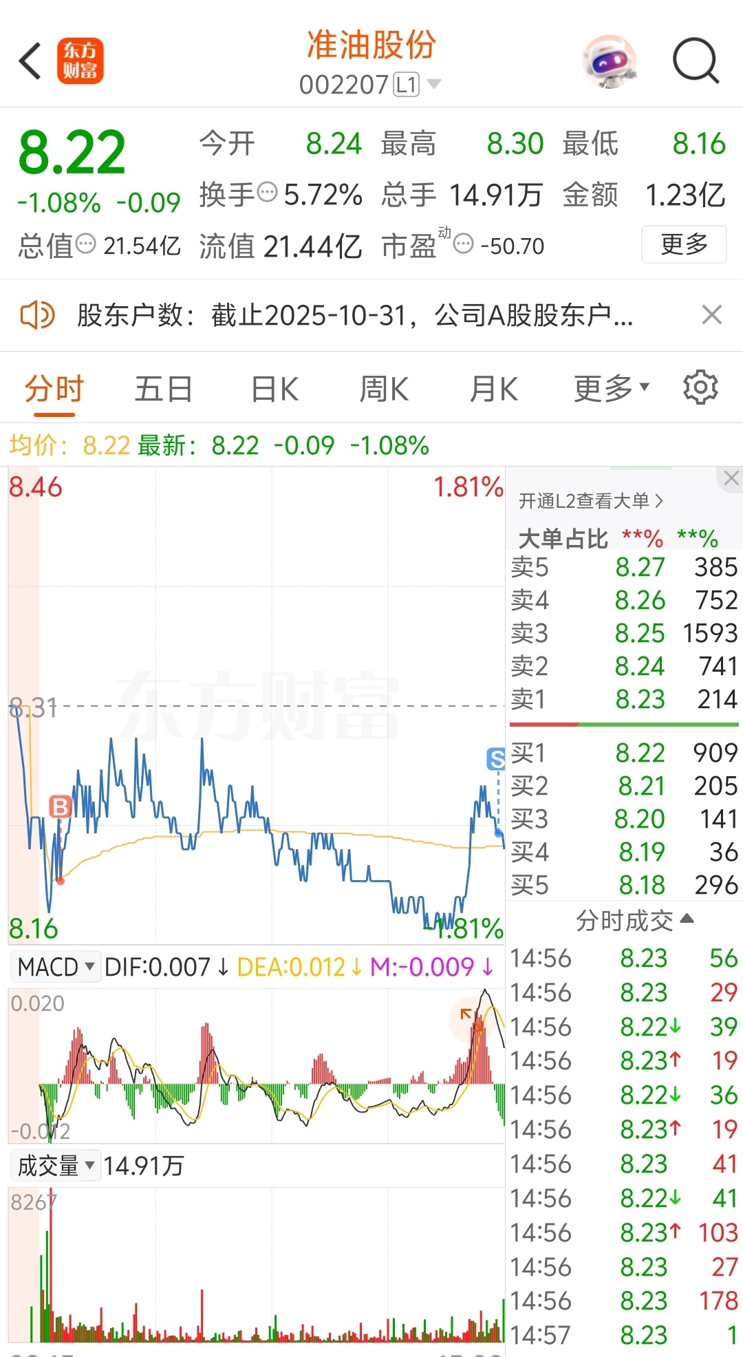 $准油股份(SZ002207)$ 今天运气好,保住了做T的本金和手续费,从分时图也能看出来,下砸到8.18均线走平没有跟着价格往下走,就在堵尾盘的拉升到均价线。明天再战吧