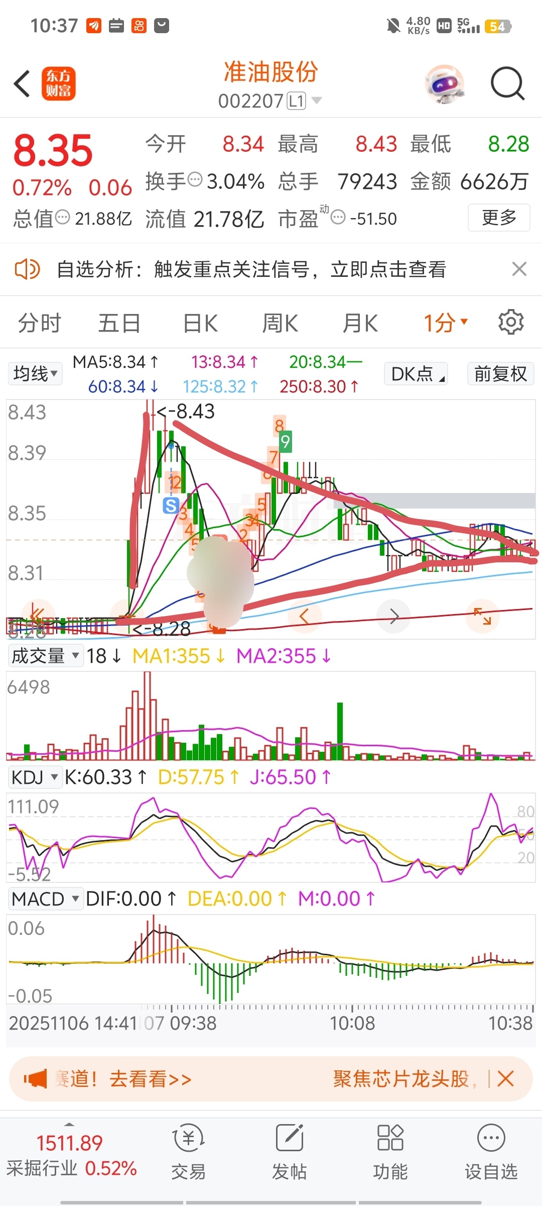 $准油股份(SZ002207)$ 来看看是不是个三角整理,突不突破就看量能