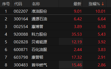 上证报中国证券网讯 11月12日早盘,石油天然气板块领涨,截至9时35分,准油股份涨停,通源石油涨超6%,惠博普、贝肯能源、首华燃气等跟涨。