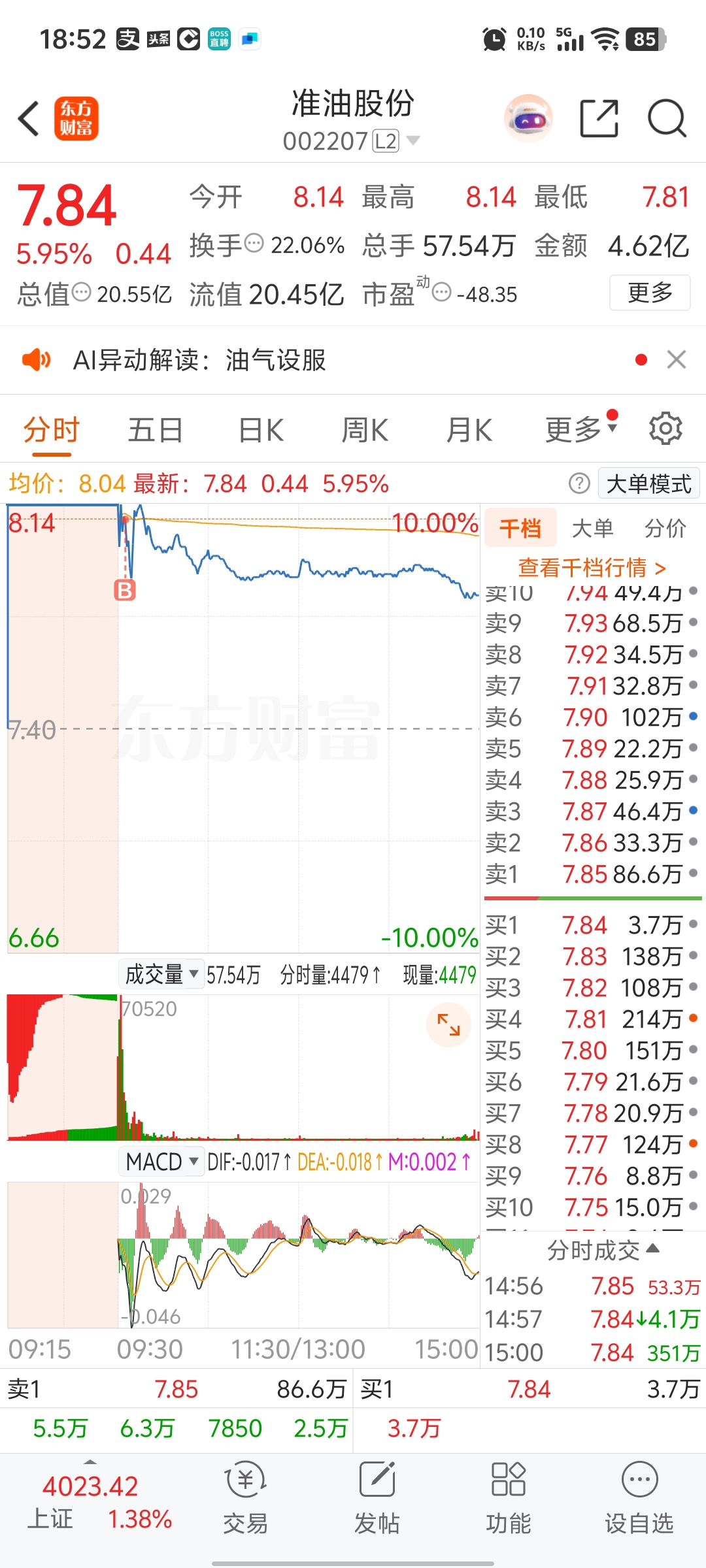 $准油股份(SZ002207)$ 早盘接近打板进的,主要是被新闻和竞价误导了,开盘整个板块走强,那打板肯定打龙头,开盘一分钟就打进去了,结果……套牢盘太多了,还是封不上!明天嘛,就看竞价了,如果深水开就想都不想直接止损了,平高开还能看看,如果是走强,肯定是开盘五分钟内的事,如果五分钟内都看不见强势,那也要止损了