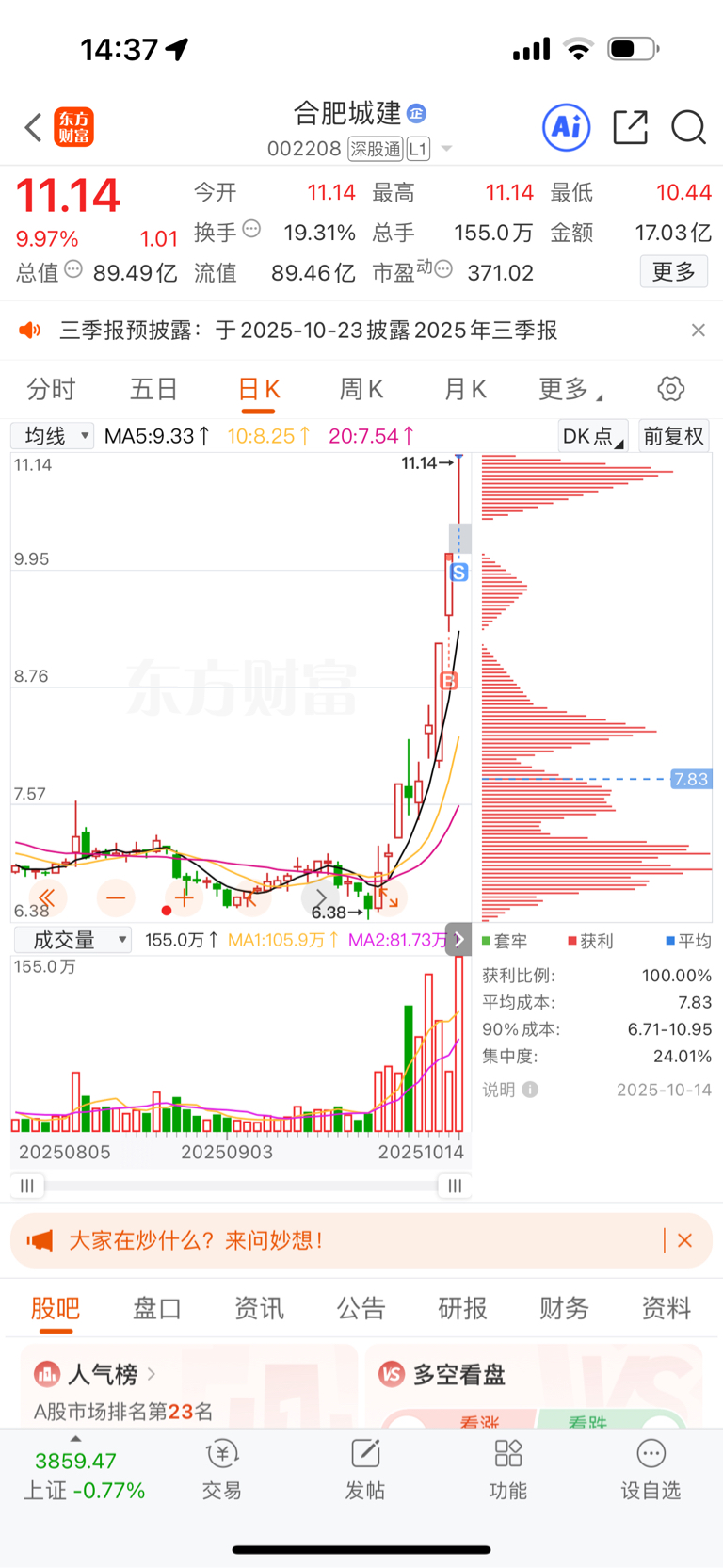 $合肥城建(SZ002208)$ 昨天打板进的,坚持了几个回封不坚持了
