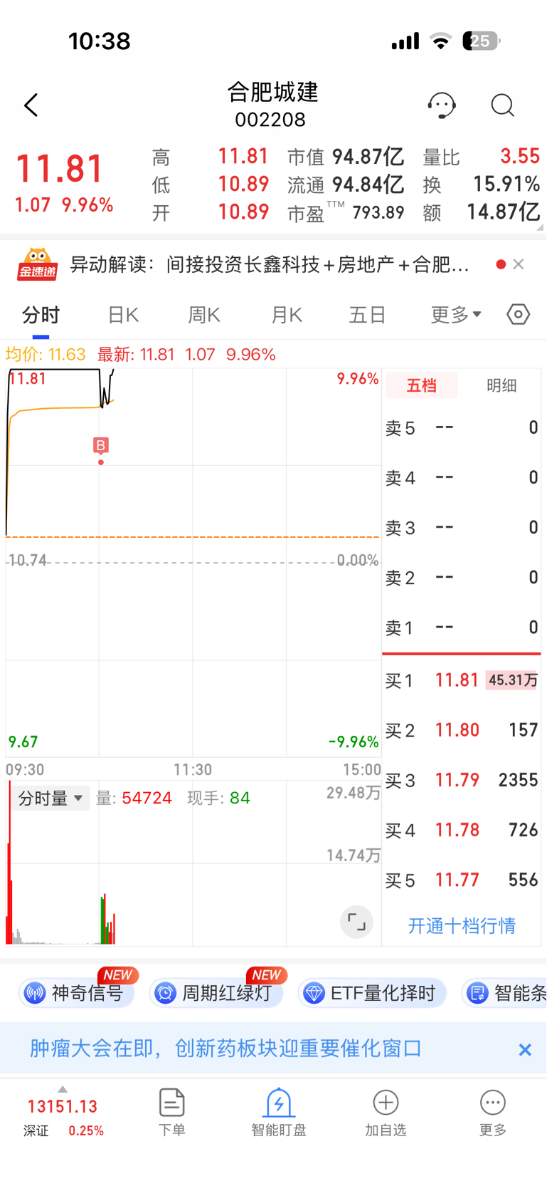 $合肥城建(SZ002208)$ 夸张,买在了5%的位置,瞬间回封