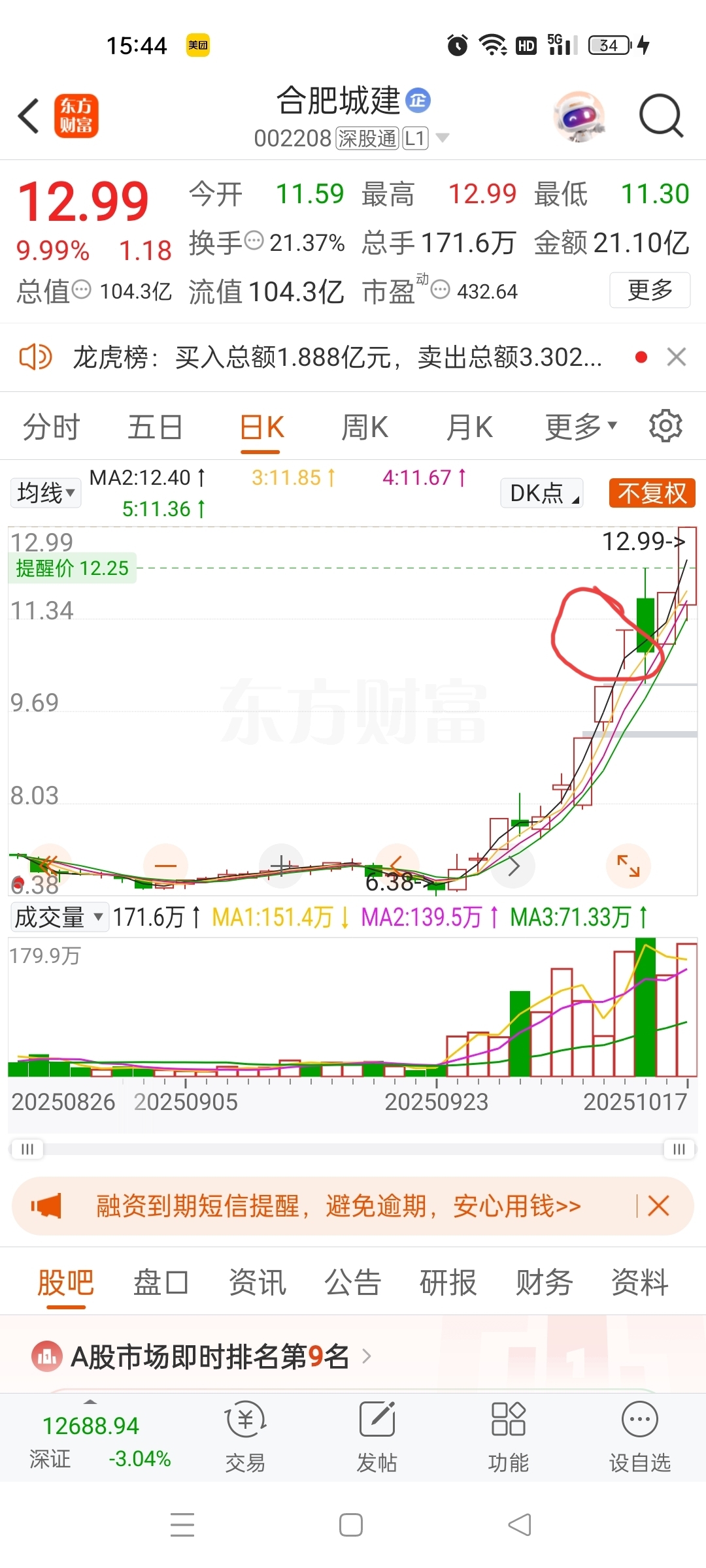 $合肥城建(SZ002208)$ 圈圈获利盘消化K线,明天有绿色抢疯