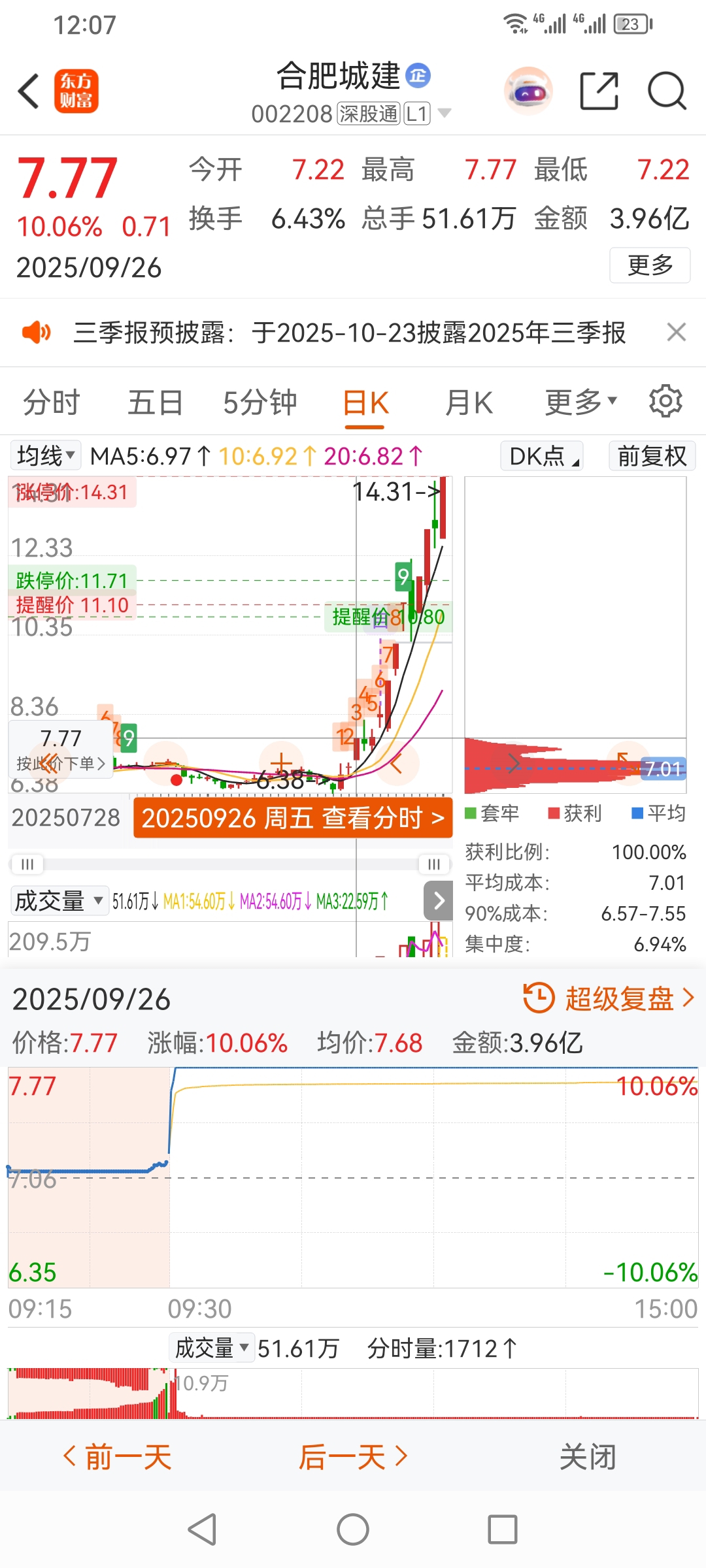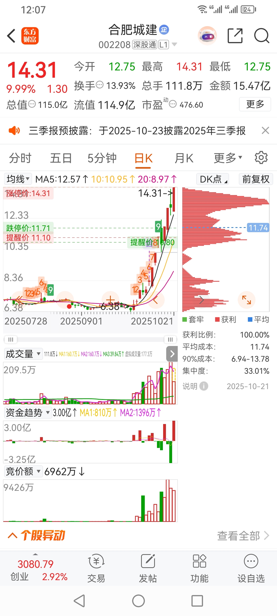 军哥,合肥城建。地区龙头股,唯一,合肥。合肥城建。首板试错突破加仓,放量买进持股