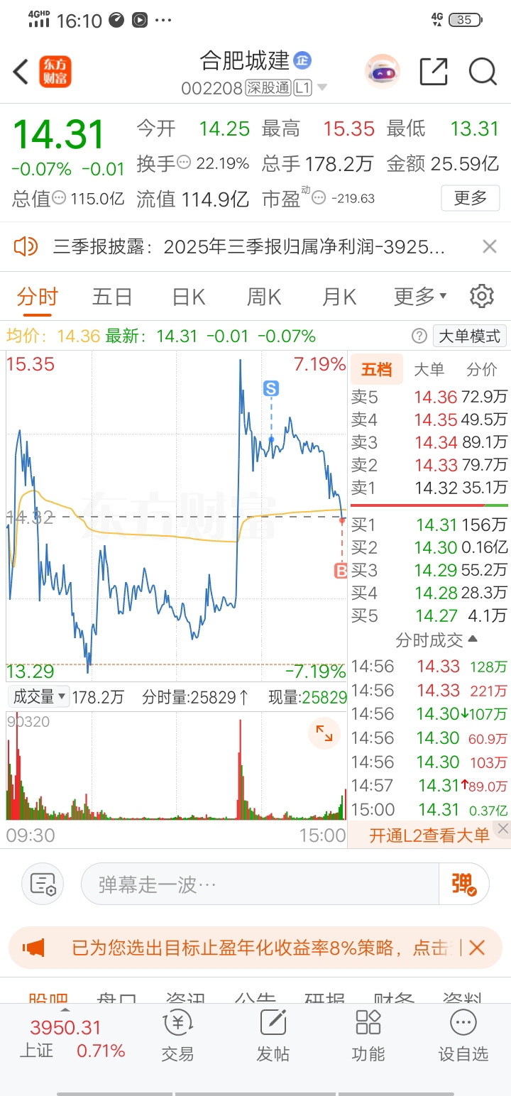 $合肥城建(SZ002208)$ 走势远没有结束,抱团标地200%异动周期才是渡劫,下午拉升一直格局他涨停,既然不涨停就大概率回零轴,所以做了个T