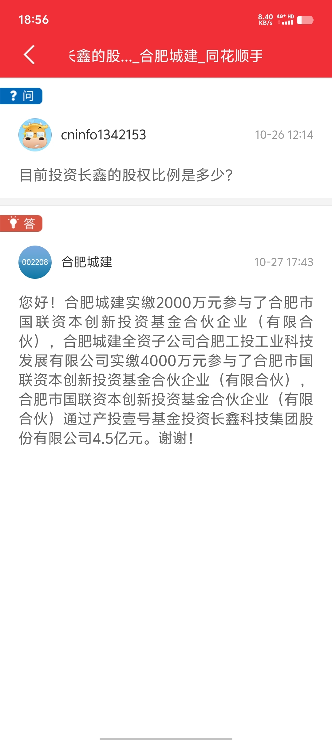 $合肥城建(SZ002208)$ 绕老绕去,原来不光大股东持股,公司本身也投入了两笔,第一笔是公司本身,第二笔是旗下子公司投资了一笔,共计6000万元投资了长鑫,这下不装了,实锤持有股权,明天开始一字板主升二波了。