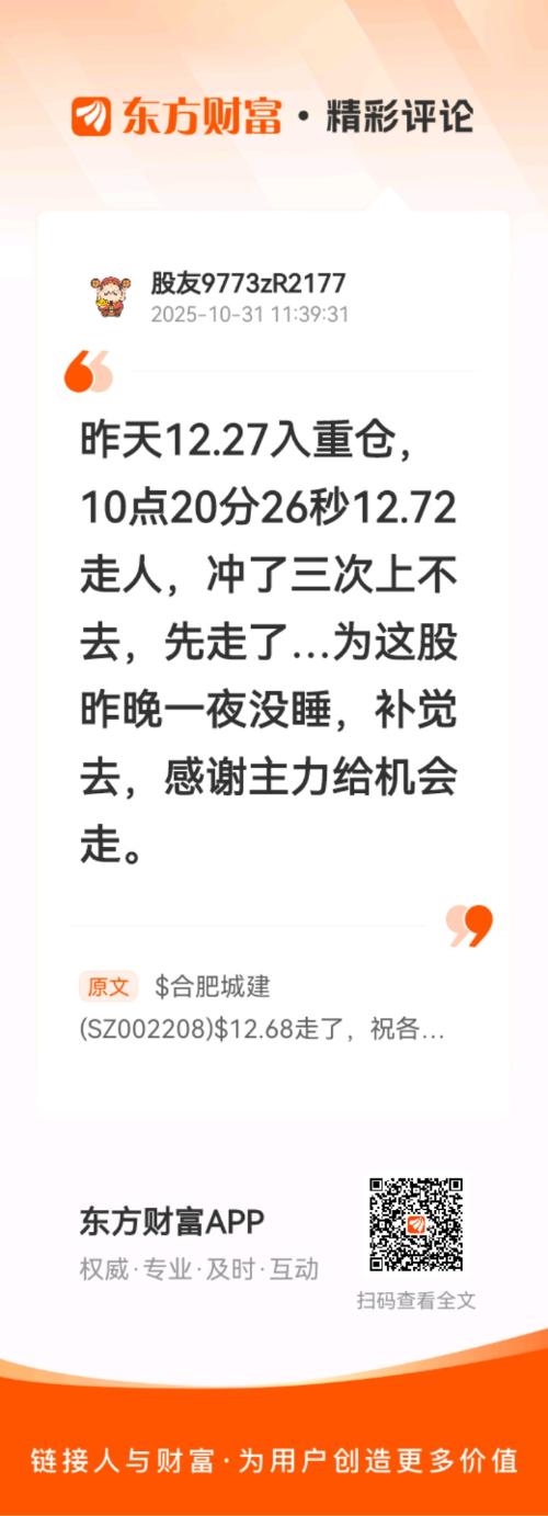 //@股友9773zR2177 :昨天12.27入重仓,10点20分26秒12.72走人,冲了三次上不去,先走了…为这股昨晚一夜没睡,补觉去,感谢主力给机会走。