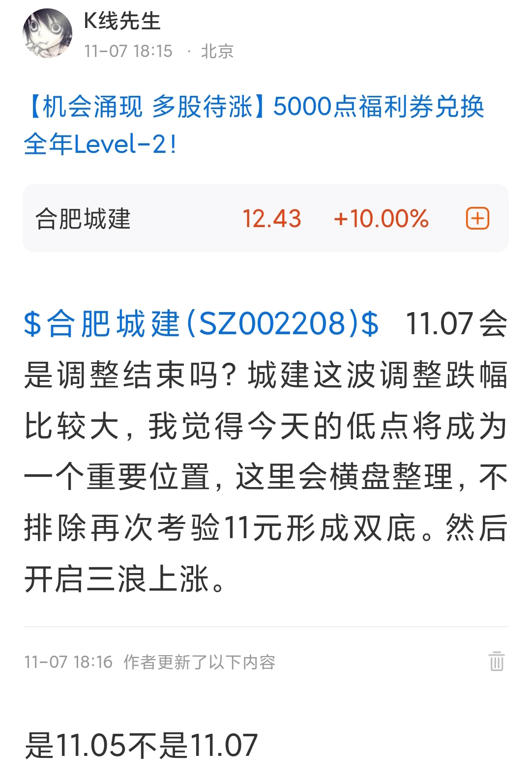 $合肥城建(SZ002208)$ 判断正确啦,11.05就是调整低点哦