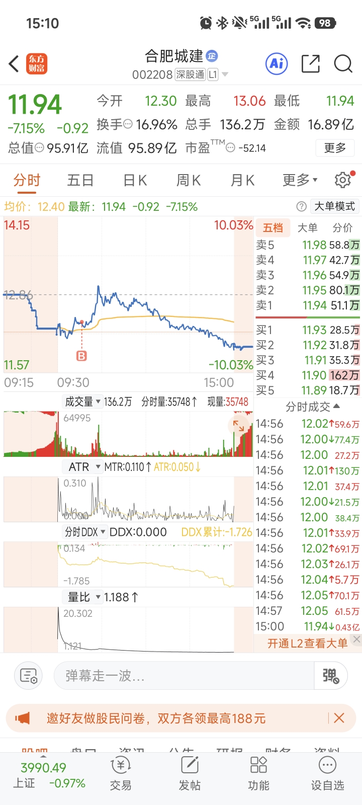 $合肥城建(SZ002208)$ 害得我中午白高兴一场!!还亏了