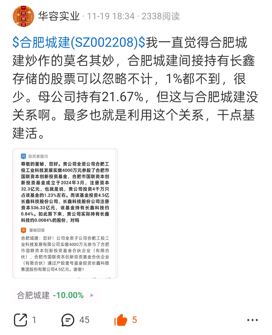 $合肥城建(SZ002208)$ 11月19号收盘我发的贴,收盘价是14.54元。当时是有多少人不服气啊,现在呢?