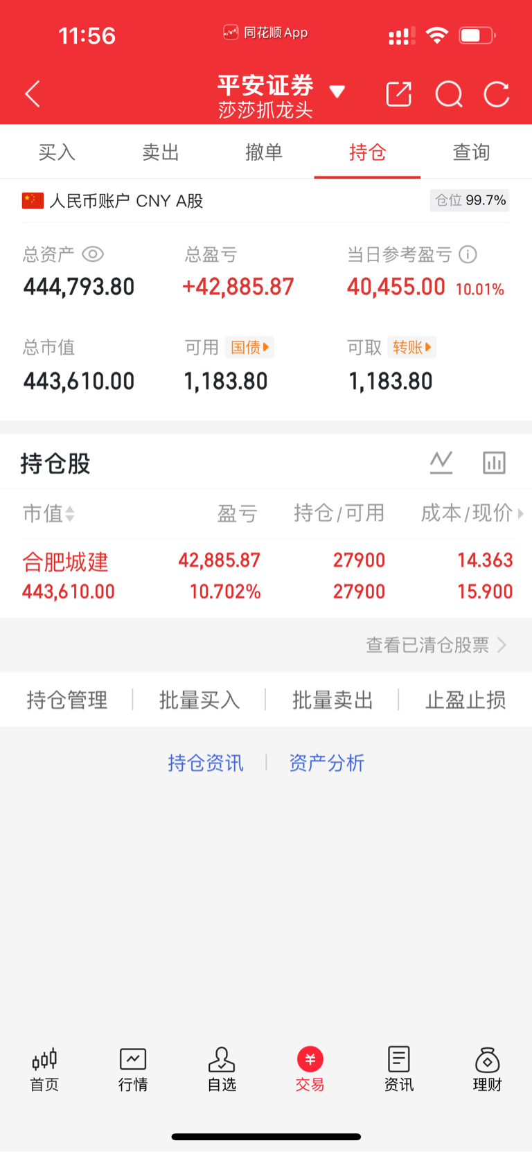 $合肥城建(SZ002208)$ 今天终于不负众望涨停了,阳哥50万入市挑战300万,现在还有44万,前几天的航天板块倒下了,让我损失惨重
