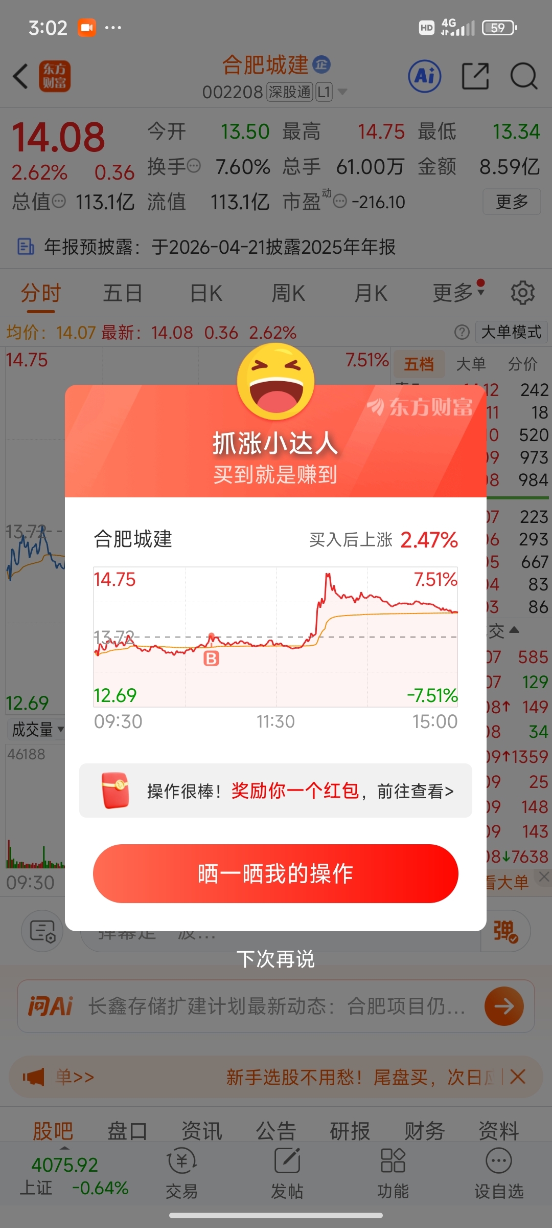 $合肥城建(SZ002208)$ 白开心一场,早上一个B以为要拉升红盘追进去,结果给我买崩了,精准买在最高点,下午居然冲刺一波,结果贪心没t出去,行吧,冲高回落瞎忙活,就这样吧,我也不卖了,有本事明天继续砸,我继续买
