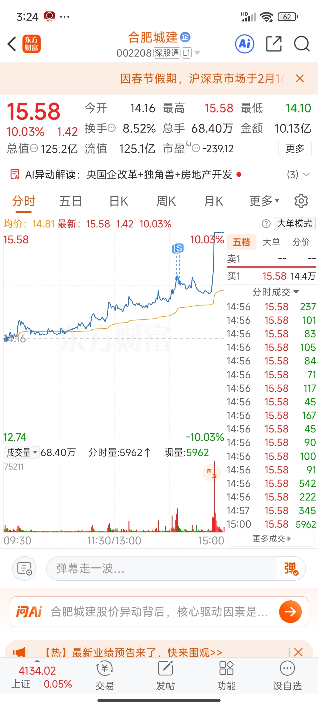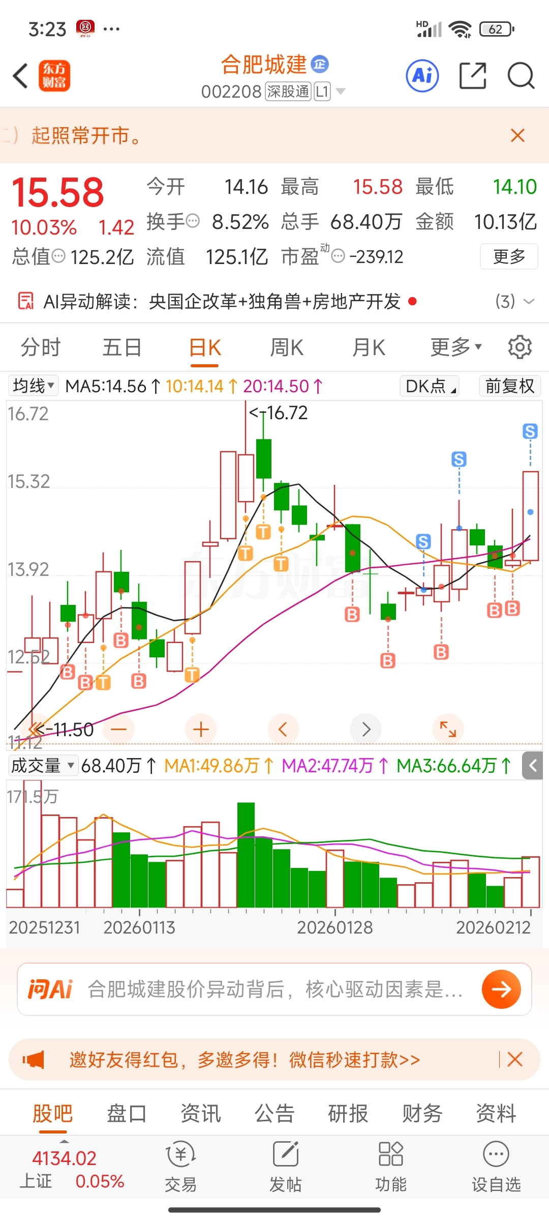 $合肥城建(SZ002208)$ 我做个t我容易嘛我,我赚个三瓜两枣的咋就那么难了,每一次都是底部进来,然后两天没走冲高回落,然后今天前脚一走,你就整这么一出,还直接涨停了,你还真是6666,让你跌破14你就是死活不跌,不然我就割肉证券全部过来了,现在好了,这次估计没机会了。就这么拿着吧
