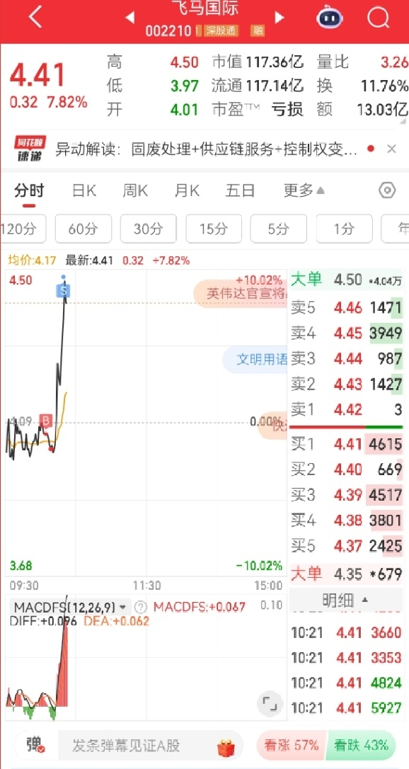$飞马国际(SZ002210)$ 今年6月份我就在思考10月份以后马年生肖龙头会是谁,我把29只带马的全部列出来看了一下,价格低 身材好 体重不重又不轻 还有肌肉的就飞马了,88 8月10号8连阳之后10天回调入场,我预测国庆前会大幅震荡 最后可能会来个涨停,给国庆期间的讨论制造话题,也为国庆后的主升浪提供舆论支撑。
