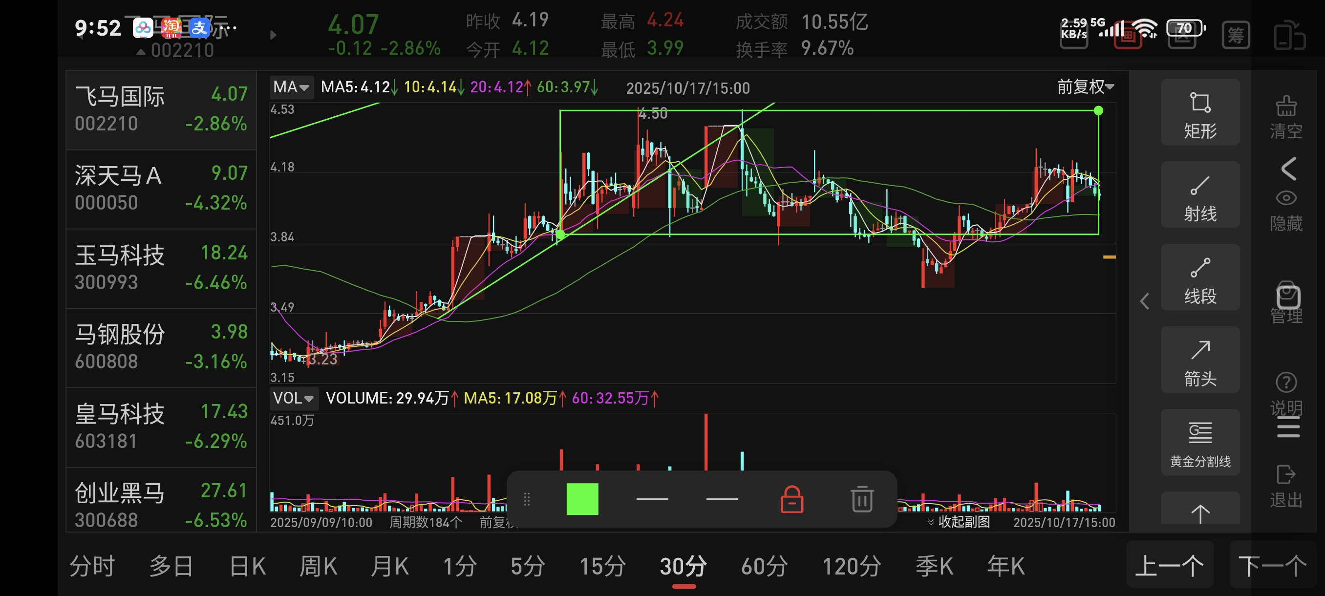 飞马国际最近一直在3.83到4.50这个箱体里晃荡,10.13利用利空短暂击破箱体很快拉回来,也洗走了一部分不坚定的胆小鬼。他在这里洗盘磨呀磨,很多人看不明白就被磨走了。他今天收盘五天线都没破,至于那么担心么?市场现在指数都在调整,个股趋势向下的有多少?它起码趋势还是向上的,日线周线月线都是多头的,干嘛非得杯弓蛇影吓唬自己?