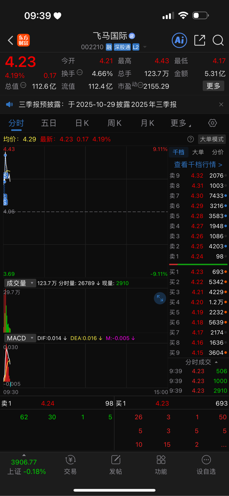 $飞马国际(SZ002210)$ 老天保佑,总共7个点卖了