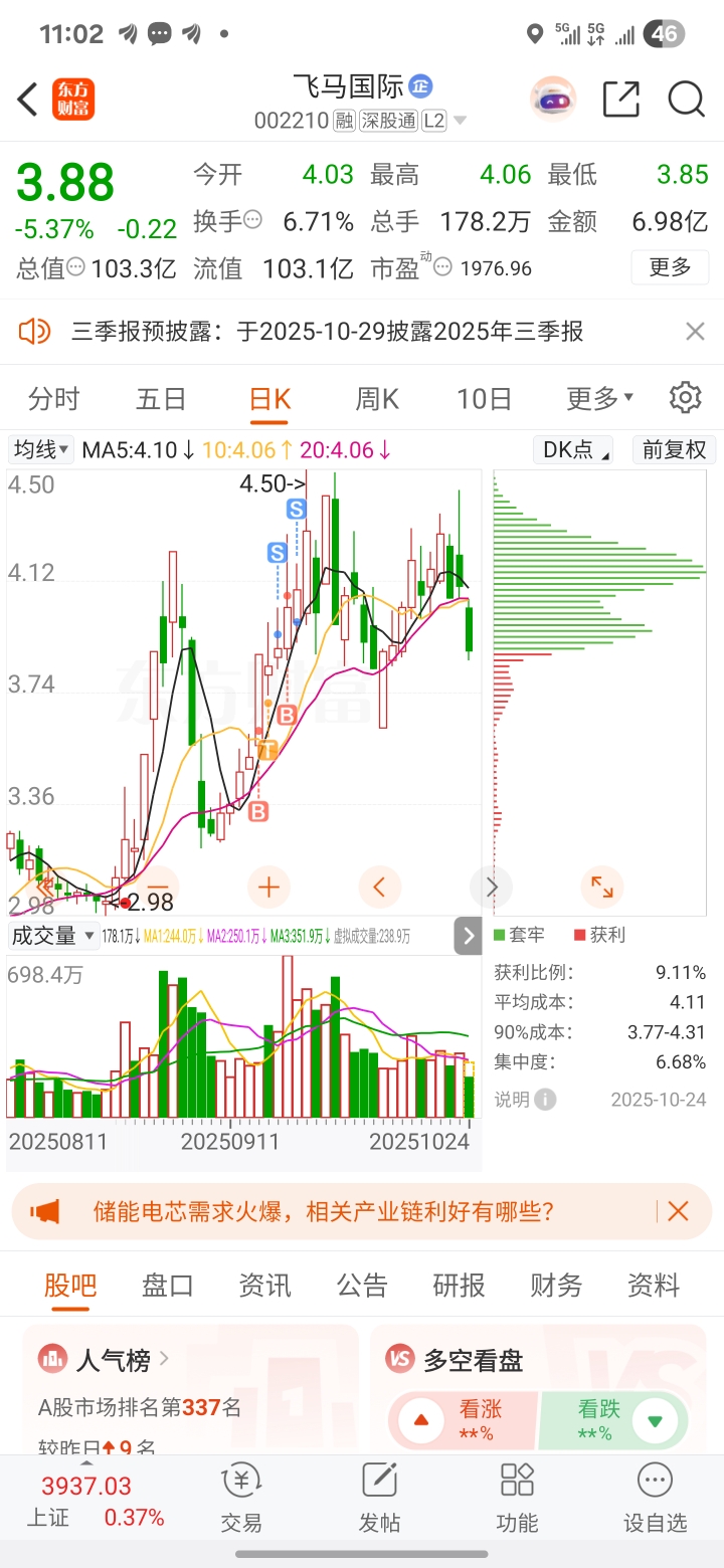 $飞马国际(SZ002210)$ 继续观望下周不破3块六进场破了3块六,直接删除自选。
