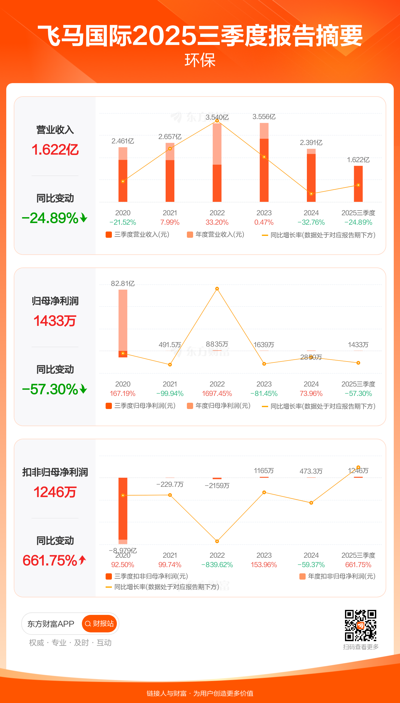 飞马国际10月29日发布2025年三季报显示,公司前三季实现营业收入1.62亿元,同比下滑24.89%;归母净利润1433.36万元,同比下滑57.30%;扣非归母净利润1246.09万元,同比增长661.75%