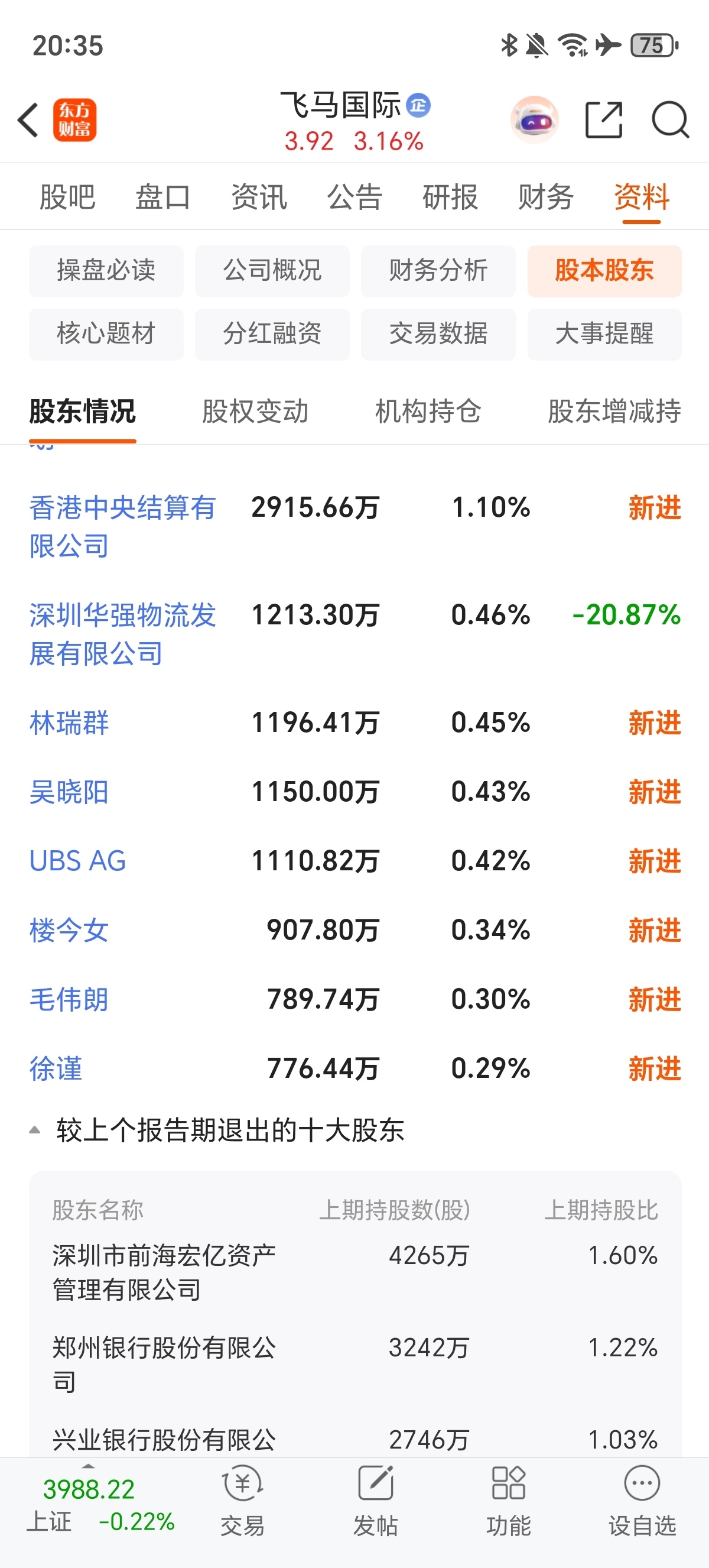 $飞马国际(SZ002210)$ 前10大股东变化很大啊!这也解释了为什么飞马近几个月换手率一直很大。机构基本走光了,进来了两大外资基金(香港和UBSAG)和5个牛散!基金估计是漳州国资拉来的,牛散是冲着重组来的!咋小散也没啥信息资源,跟着大户冲冲冲吧