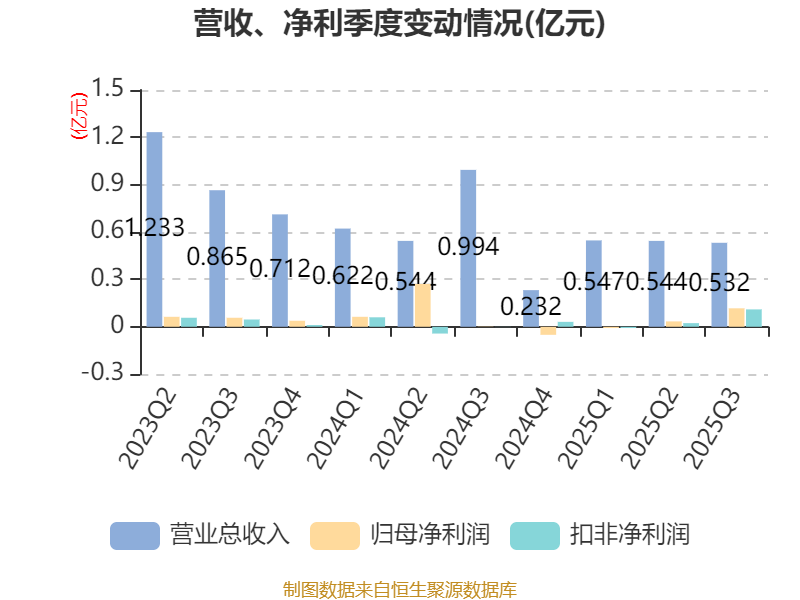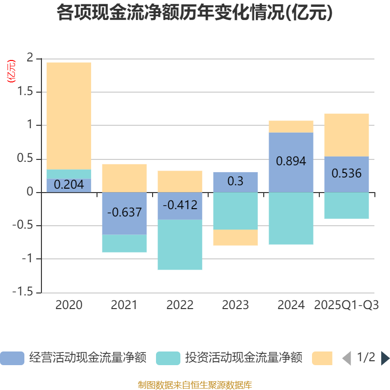 2025年前三季度,公司经营活动现金流净额为5364.19万元,同比增长18.58%;筹资活动现金流净额6386.54万元,同比增加9451.05万元;投资活动现金流净额-3967.02万元,上年同期为-4810.28万元。