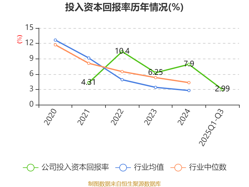 盈利能力方面, 2025年前三季度公司加权平均净资产收益率为2.45%,同比下降8.75个百分点。公司2025年前三季度投入资本回报率为2.99%,较上年同期下降6.2个百分点。