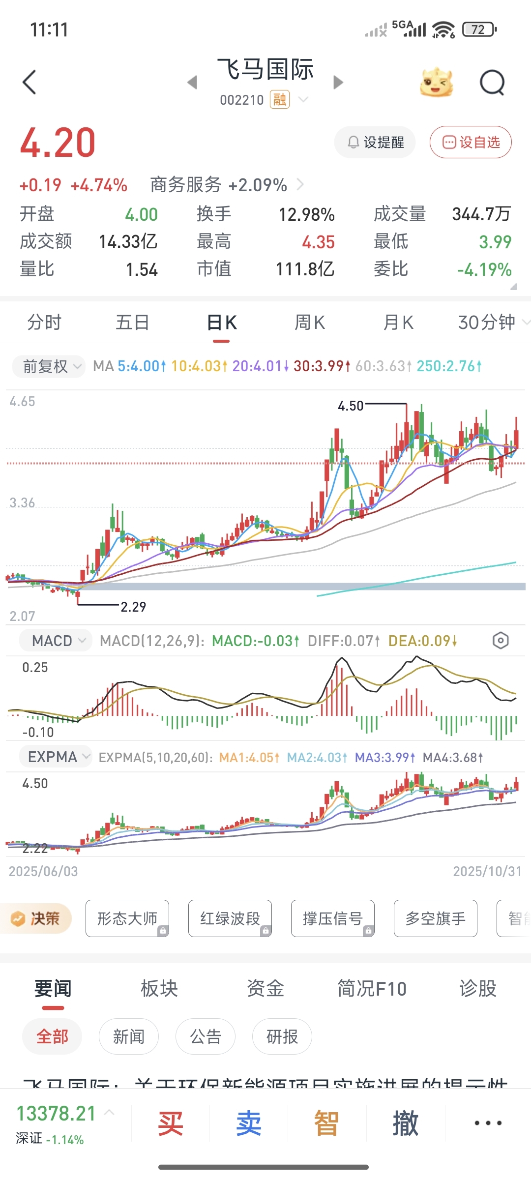 $飞马国际(SZ002210)$ 现在领头马辨识强度都挺好,但是股价较高,离年底还远,前有福建板块,后有群马追赶,很容易累马,2210目前这个含苞欲放的走势,外加重组,双buff叠加,公司配合叙事,那就是连板上去了,横有多长竖有多高,按4.2,9个板也才9.9,所以跨年啥的,鹿死谁手还未知。