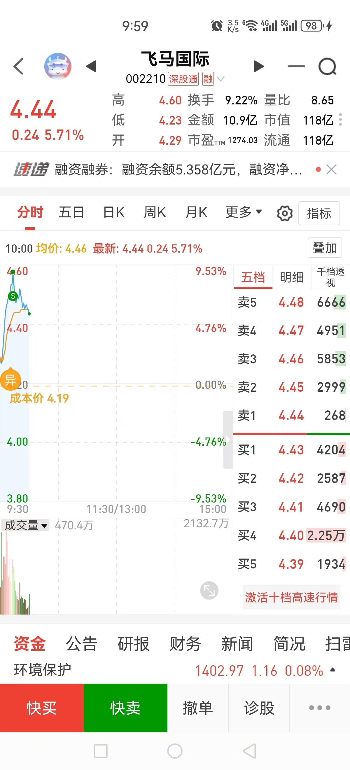 飞马封涨停难,现在应该没有到时候,4.59清仓卖飞认命,就是有点纠结今天该什么价