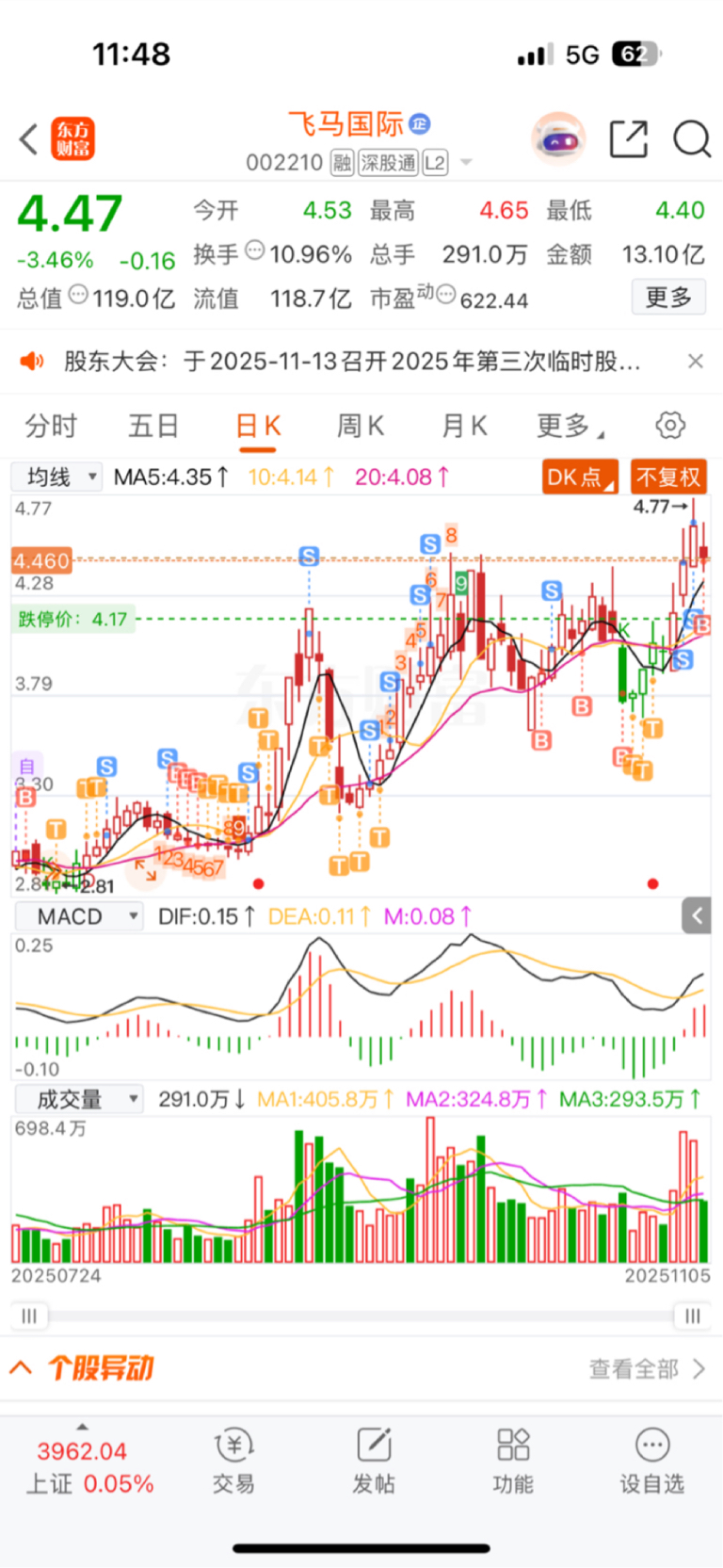 $飞马国际(SZ002210)$ 昨天4.72赚钱清仓的,今天第三次进来了,先买一成仓,记录一下。