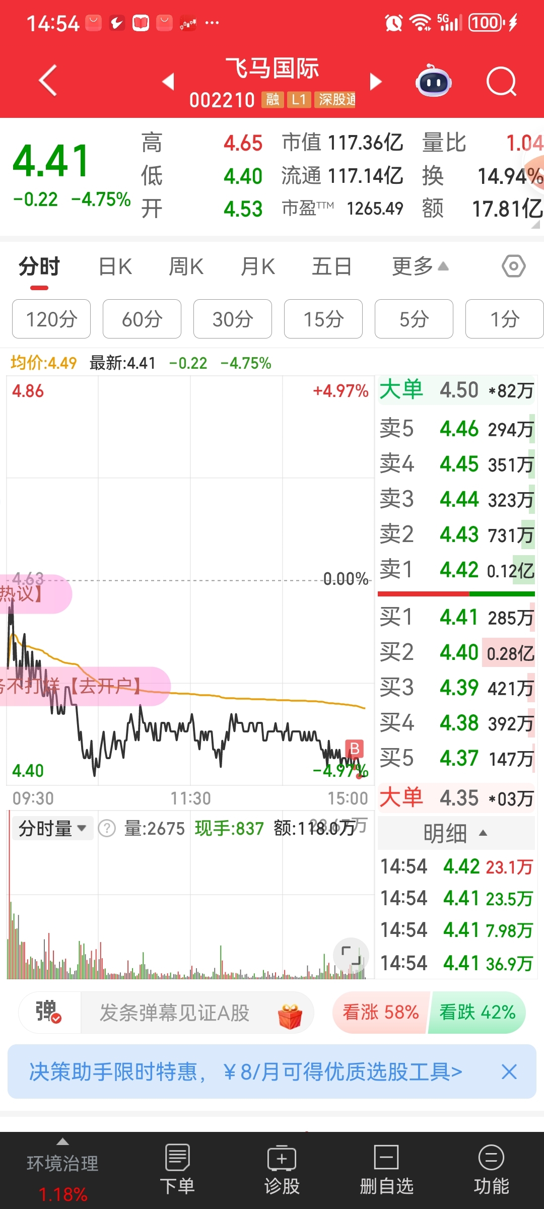 $飞马国际(SZ002210)$ 4.42、4.41买入,飞马国际每个小波段的首阴,下一天都有利可图,所以,买了点试试