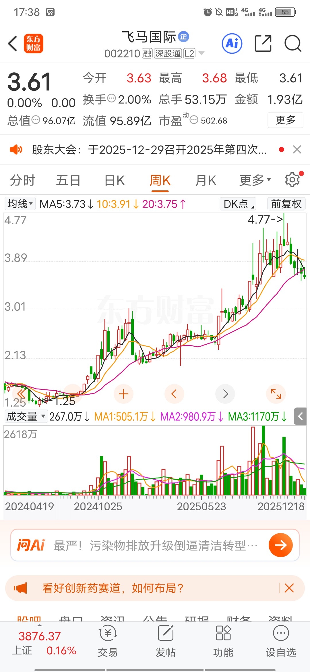 $飞马国际(SZ002210)$ 位置的确一言难尽,缩量下跌还要跌啊,唉,位置太高了,马年行情结束很久了,今年没蹭上热度。