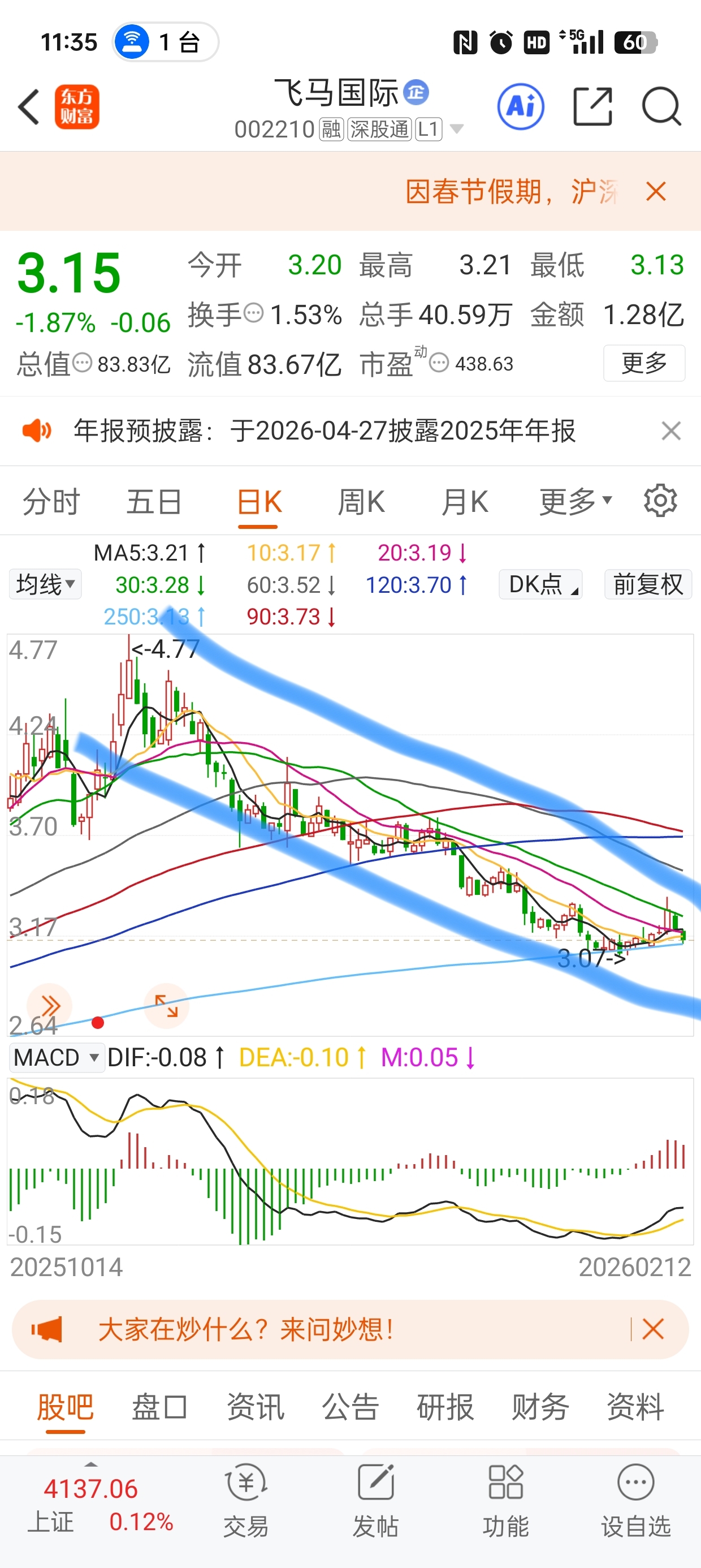 下跌趋势,只有过3.8才能反转,过了3.8才可以买,千万别被一群猴子忽悠了,他们天天吹涨,吹了三个月,跌啦三个月。他们越吹,越不要碰。