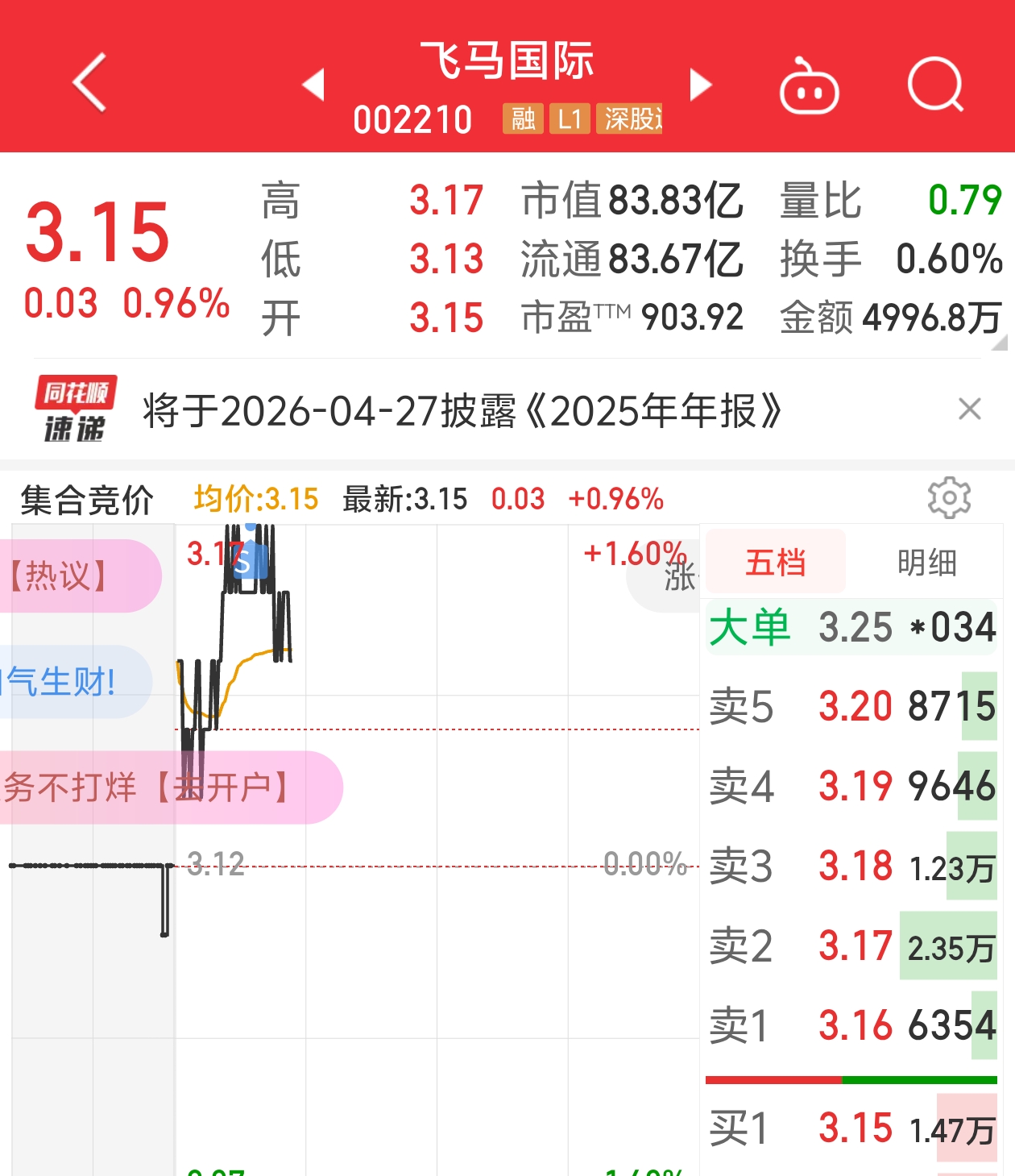 $飞马国际(SZ002210)$ 3.17卖了,挂了3.14买,坐等回落