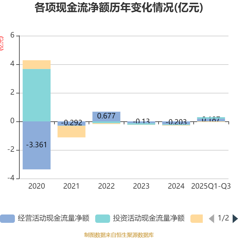 2025年前三季度,公司经营活动现金流净额为1869.43万元,同比增加3294.31万元;筹资活动现金流净额-460.4万元,同比减少192.09万元;投资活动现金流净额1082.6万元,上年同期为-301.68万元。
