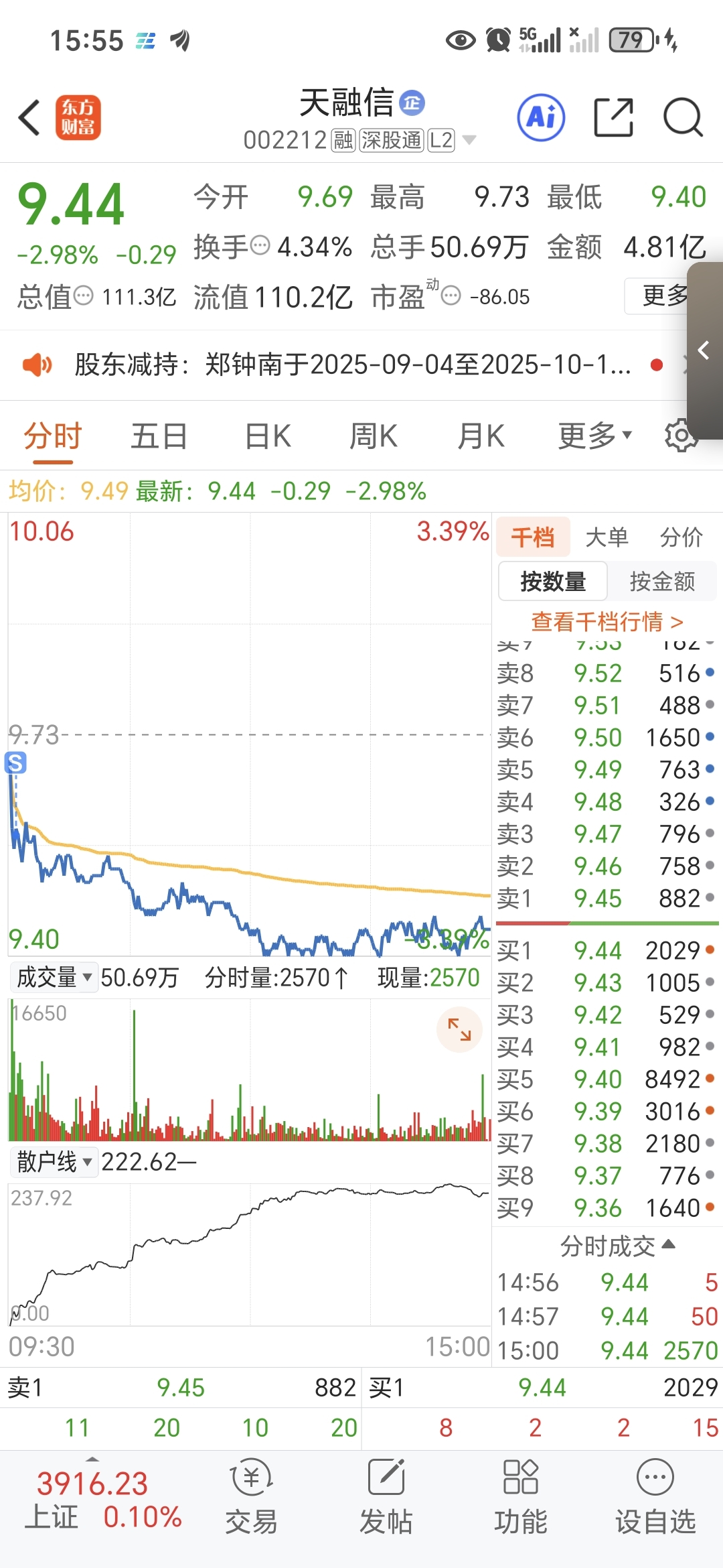 $天融信(SZ002212)$ 本来挂9.75红着卖,没想到最高9.73,这2分钱也不能贪真是