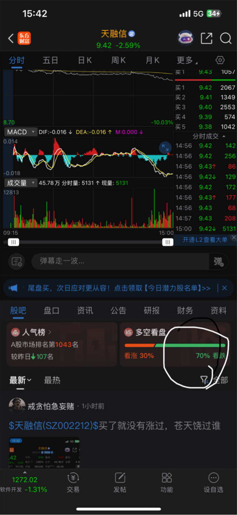 $天融信(SZ002212)$ 完蛋了百分之70看空,周一怎么办,各位