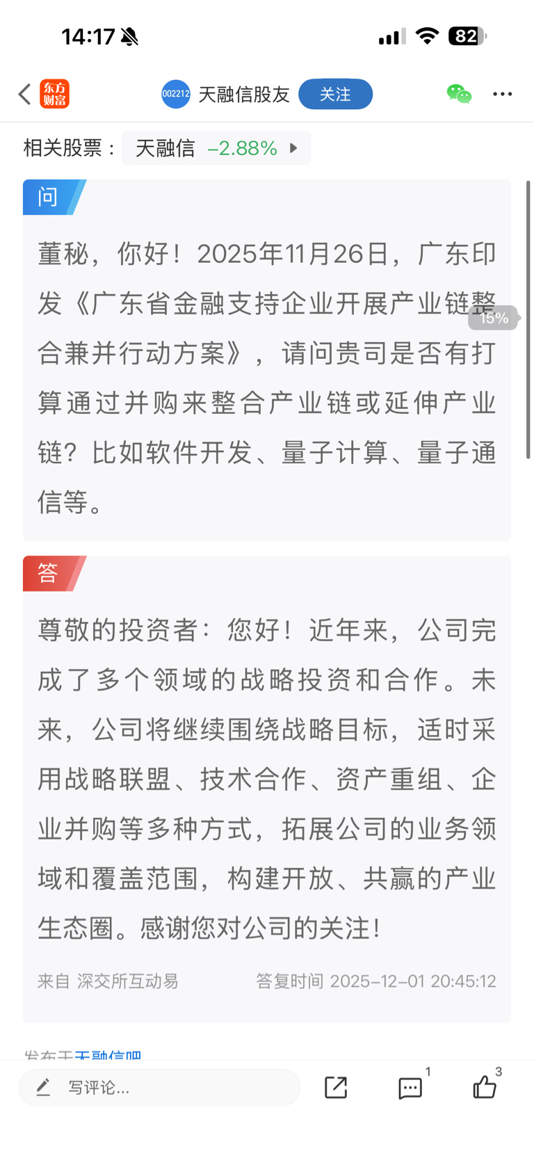 $天融信(SZ002212)$ 本人再次强调一下,是董秘说的在未来,公司将继续围绕战略目标,适时采用战略联盟、技术合作、资产重组、企业并购等多种方式,拓展公司的业务领域和覆盖范围,构建开放、共赢的产业生态圈。谁在造谣,我将依法对其提起诉讼,追究其法律责任。
