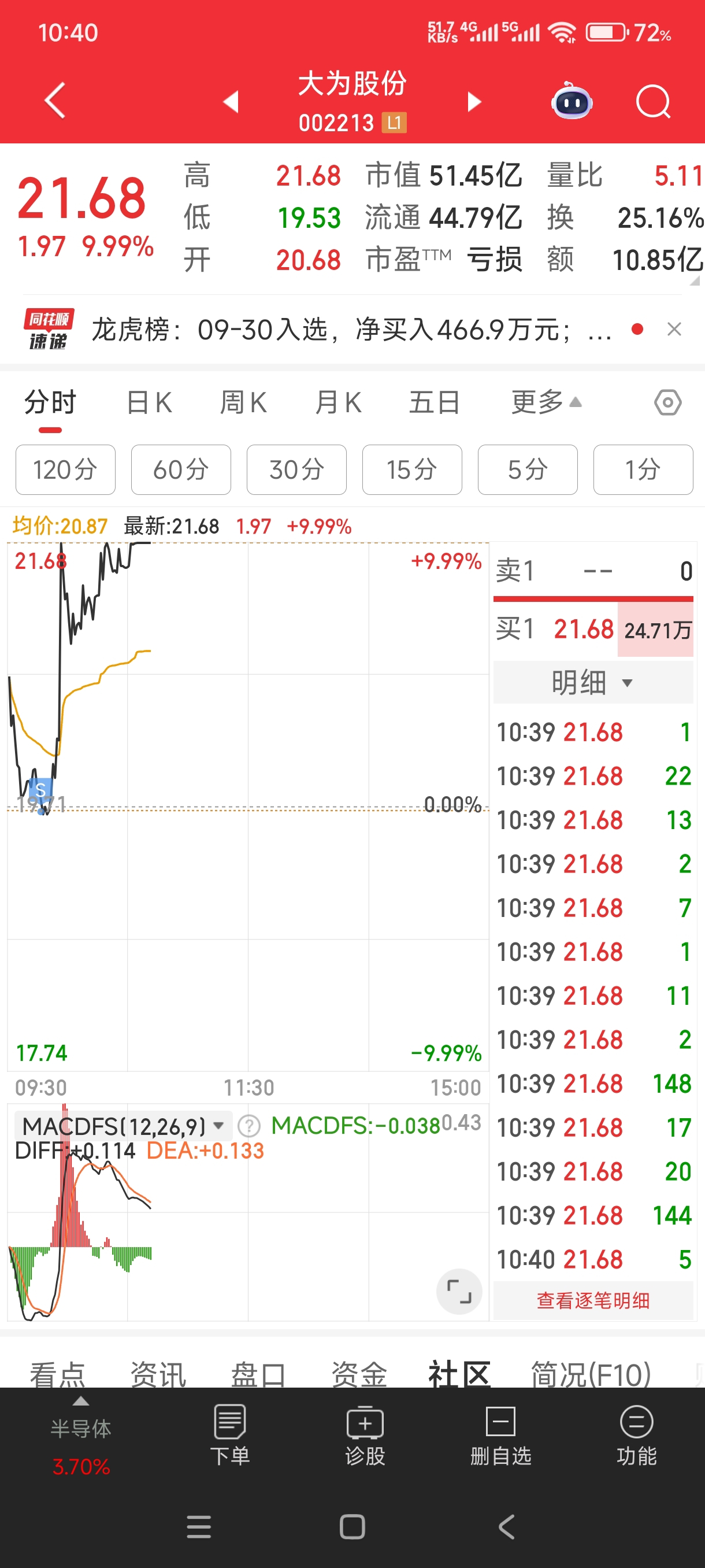 $大为股份(SZ002213)$ 这机构黑的很竞价不拉涨停就算了,20.88最后一秒变20.68,害我集合竞价没卖出去,后没越大跳水,把我吓出来了