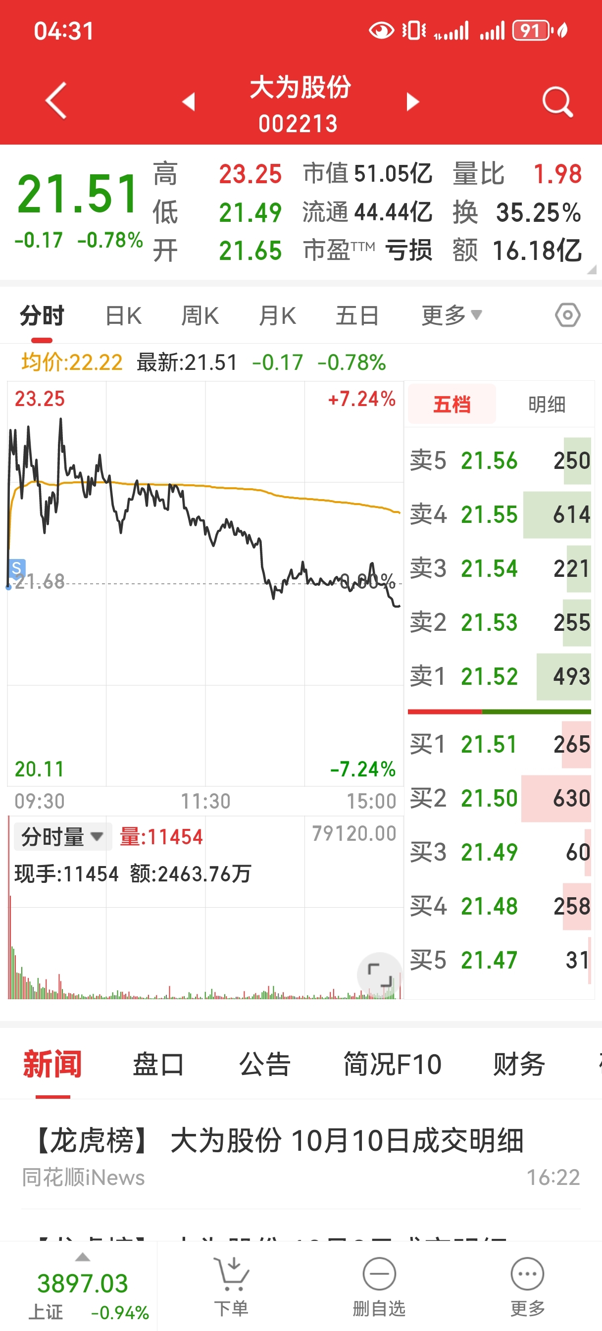 $大为股份(SZ002213)$ 大为股份集合竞价出了,没有卖在高点。去年二连板后12月6日集合买过转天割肉,这次弥补回来了