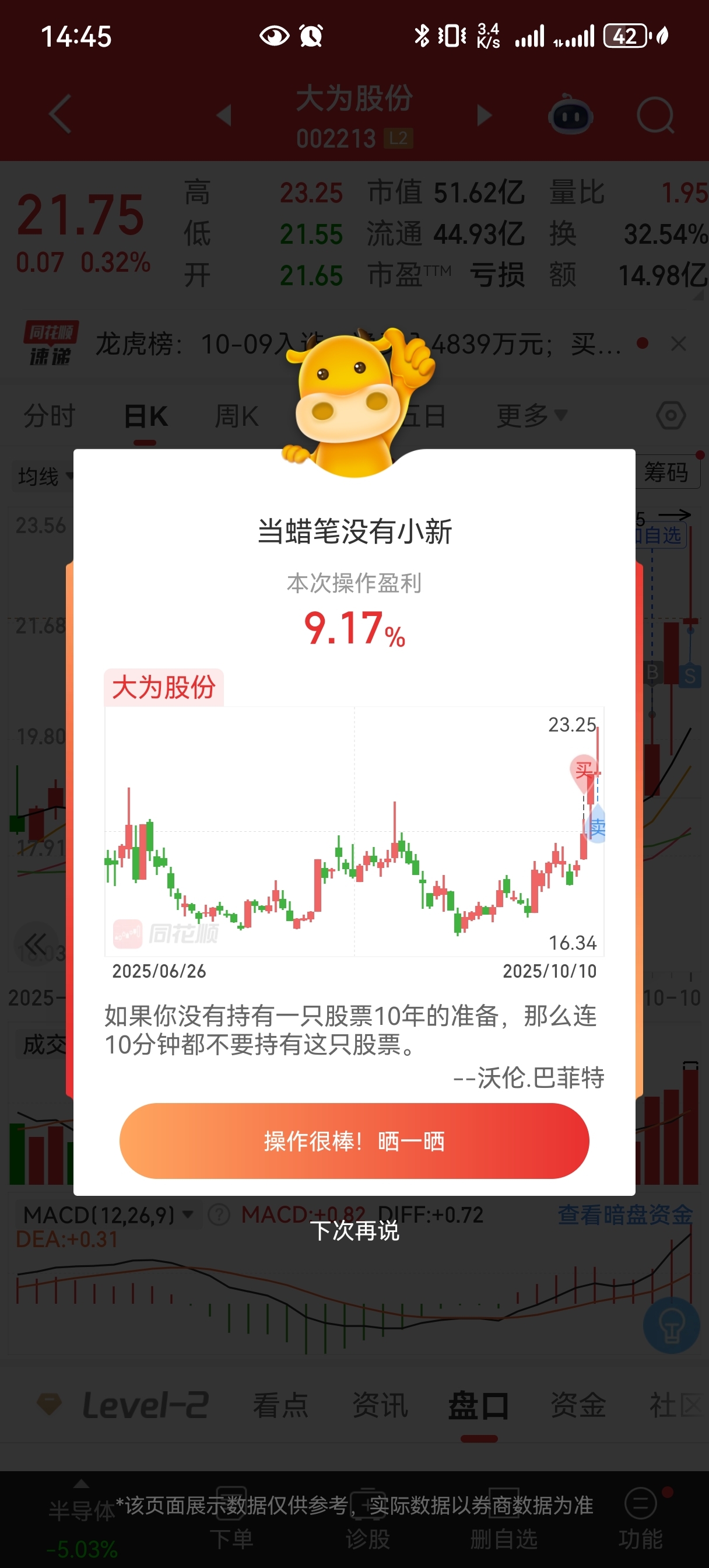 $大为股份(SZ002213)$ 走了,落袋为安,留下来的发财