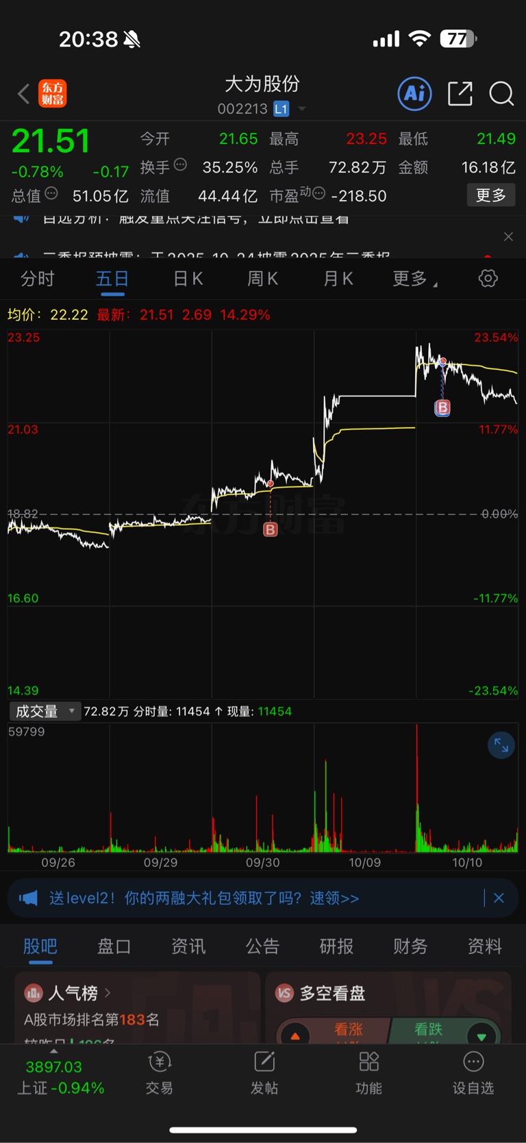 $大为股份(SZ002213)$ 出来了感谢!接回100股放账户里喜庆