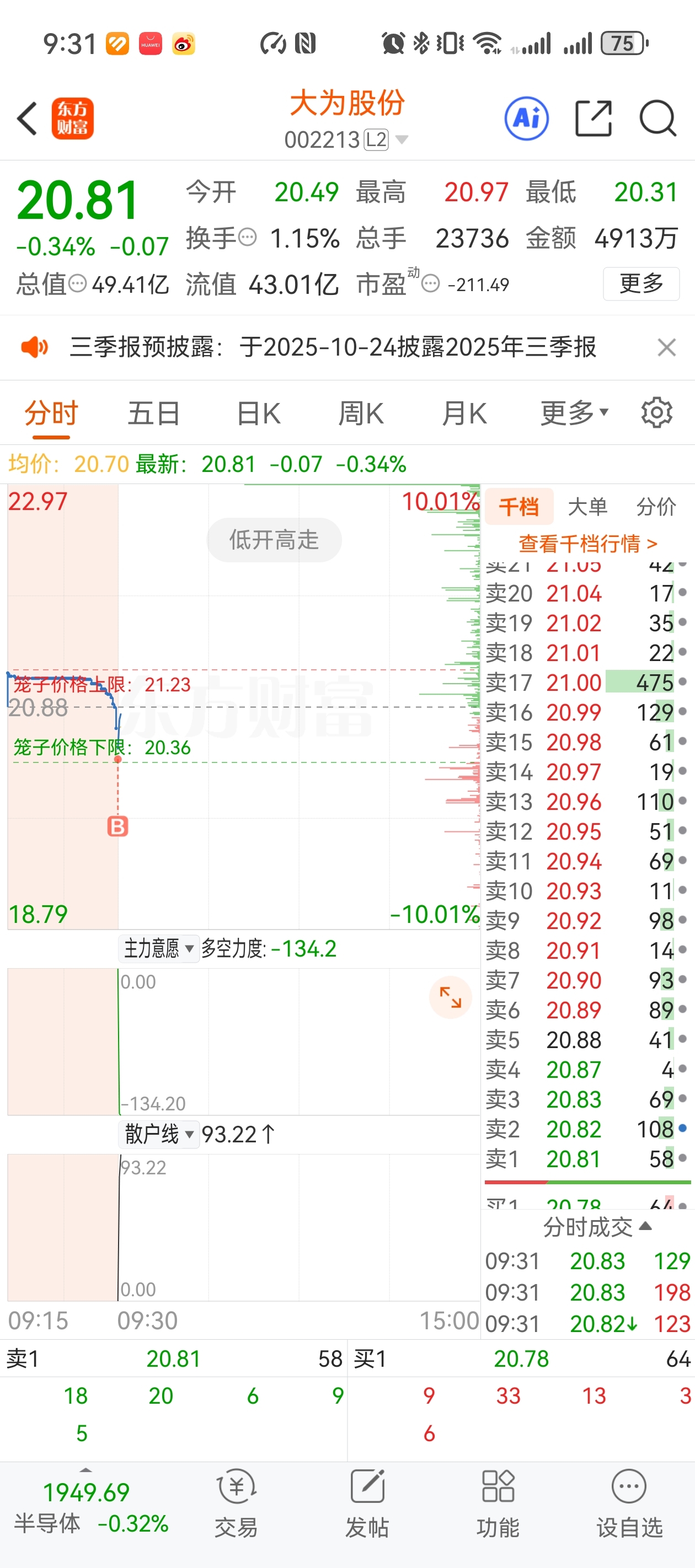 $大为股份(SZ002213)$ 太险了,要是挂低两分钱就买不到了。。。。哈哈哈,差不多最低价买入