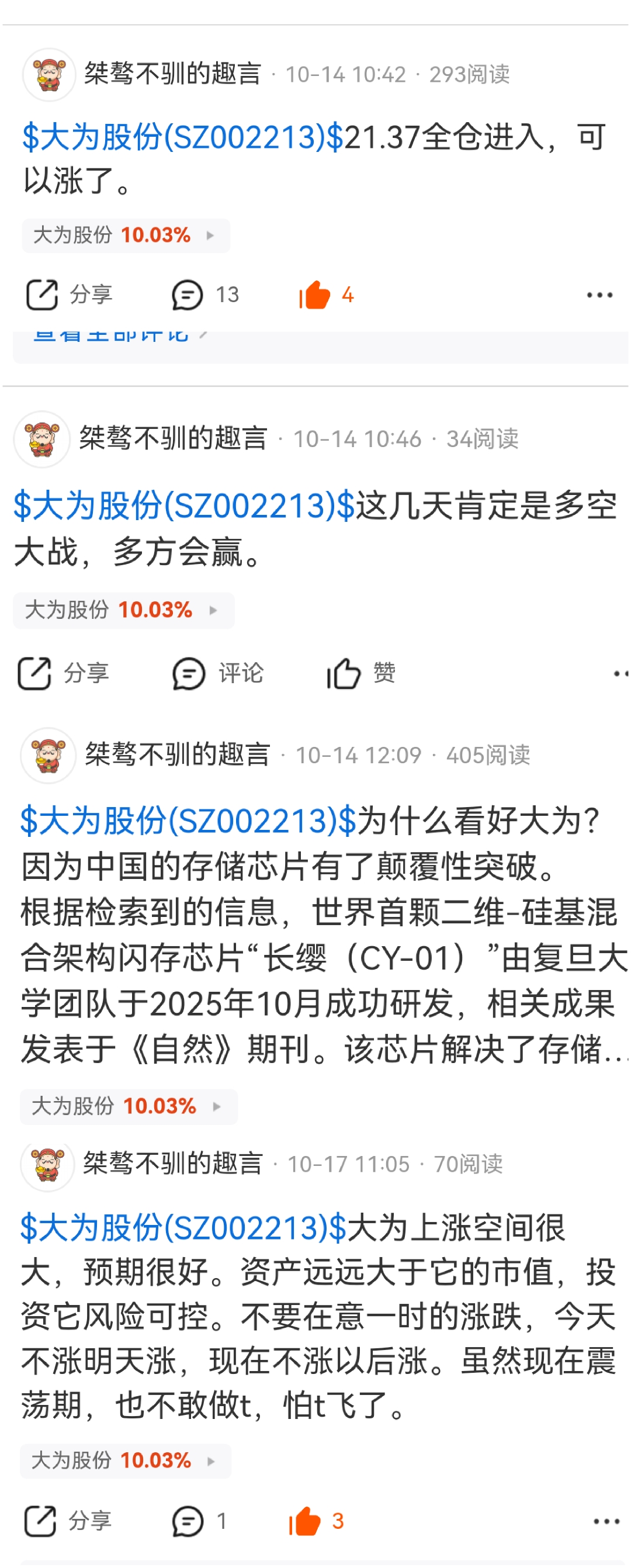 $大为股份(SZ002213)$ 还有人记得我发过的帖吗?当时全仓多少让人觉得有点悲壮呀。