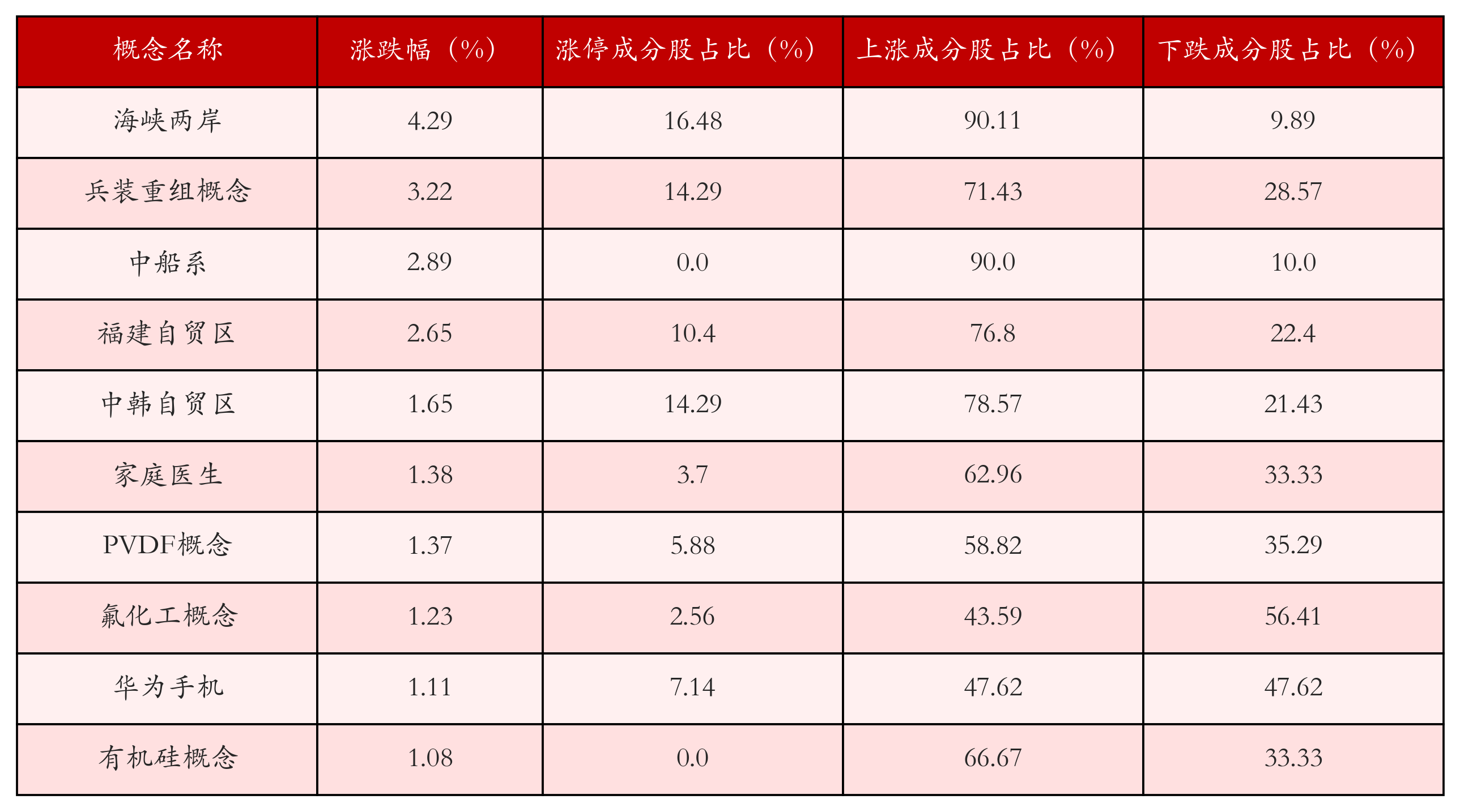 根据A股概念涨跌幅与所对应的股票池综合分析,涨幅靠前的三个概念板块分别为:海峡两岸、兵装重组概念与中船系。排名前10位的概念板块相关数据见下表: